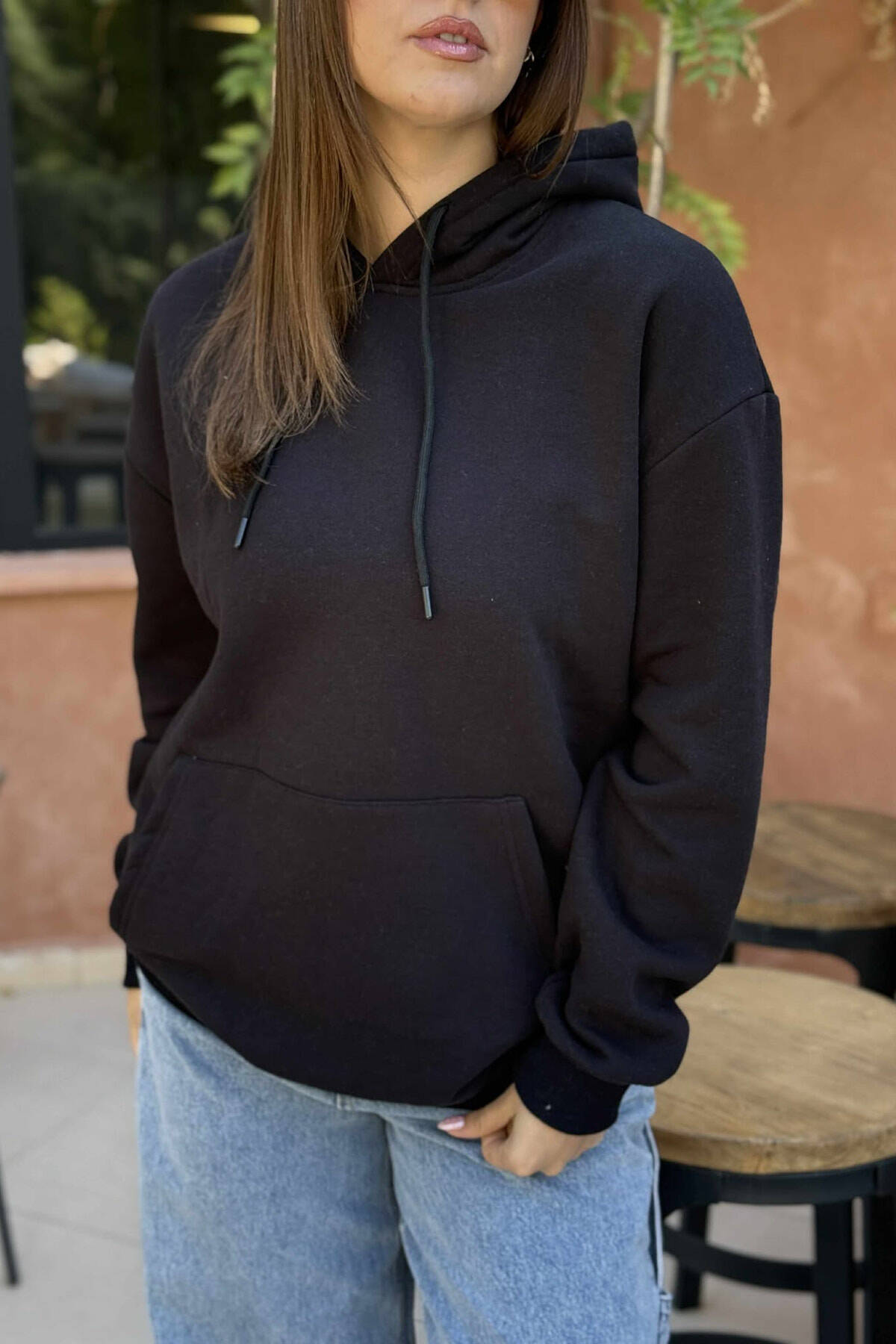 HOODIE E THJESHTË NJË NGJYRËSHE ME PUSH PËR FEMRA NË NGJYRË TË ZEZË