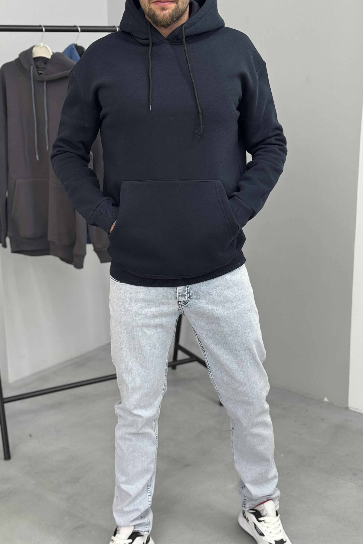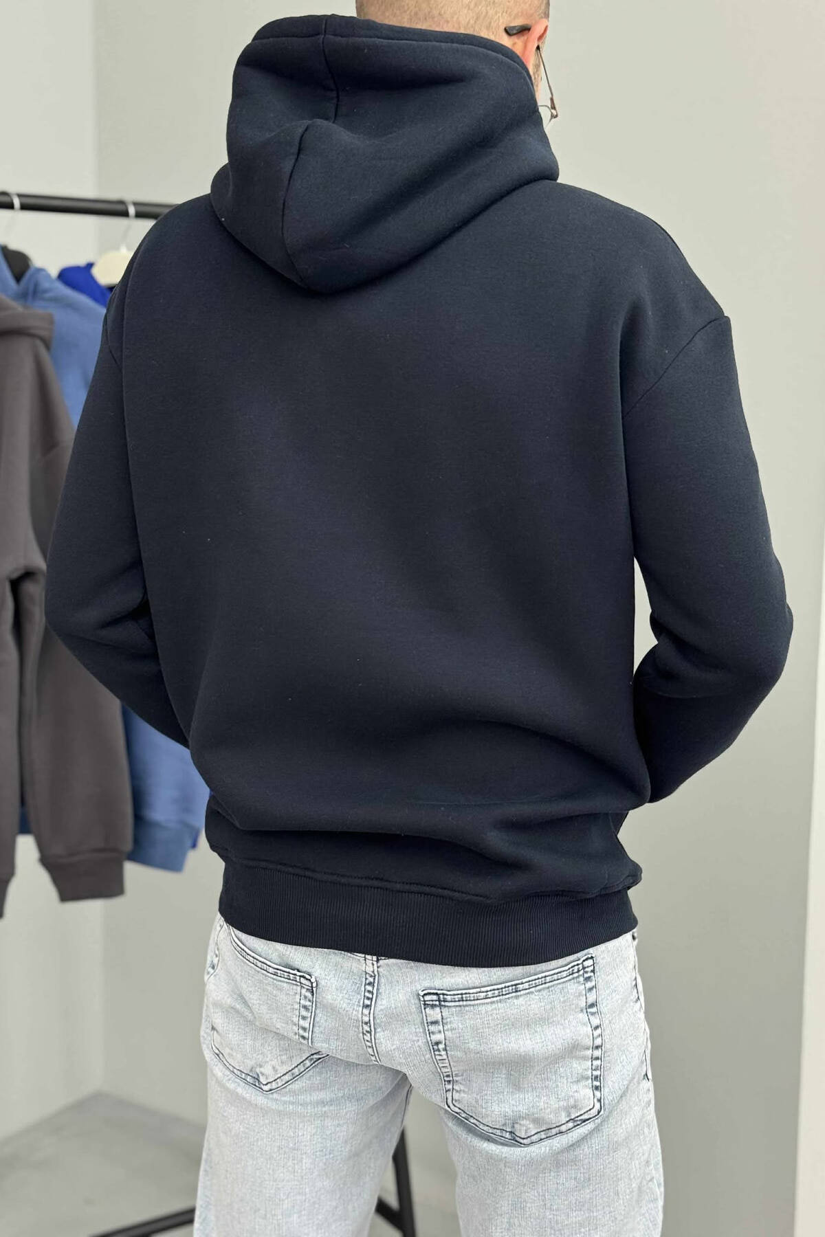 HOODIE E THJESHTË NJËNGJYRËSHE ME PUSH PËR MESHKUJ NË NGJYRËN BLU TË ERRËT