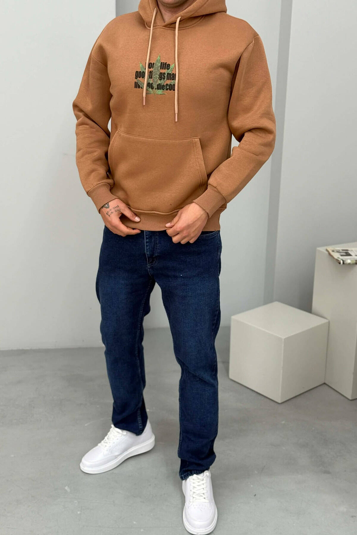 HOODIE NJE NGJYRESHE ME PUSH DHE DETAJE TE VOGLA PER MESHKUJ NE NGJYRE BEZHE