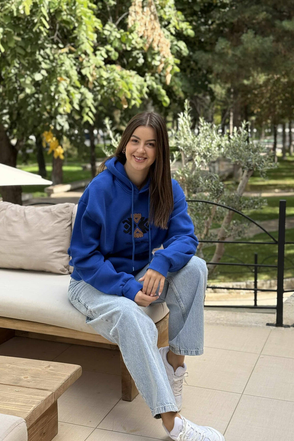 HOODIE ME PUSH DHE DIZAJN NË PJESËN PARA DHE PAS PËR FEMRA NË NGJYRËN BLU
