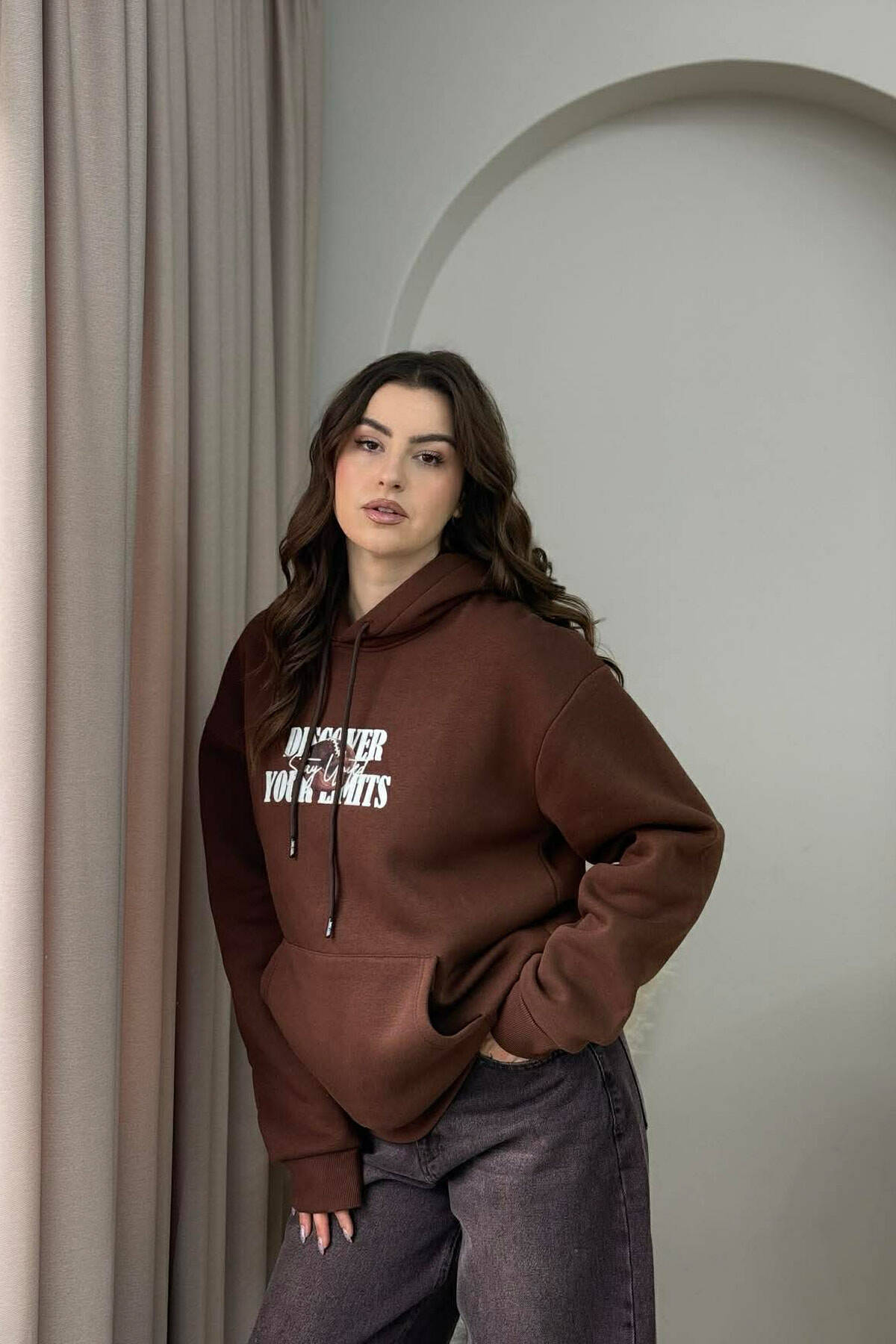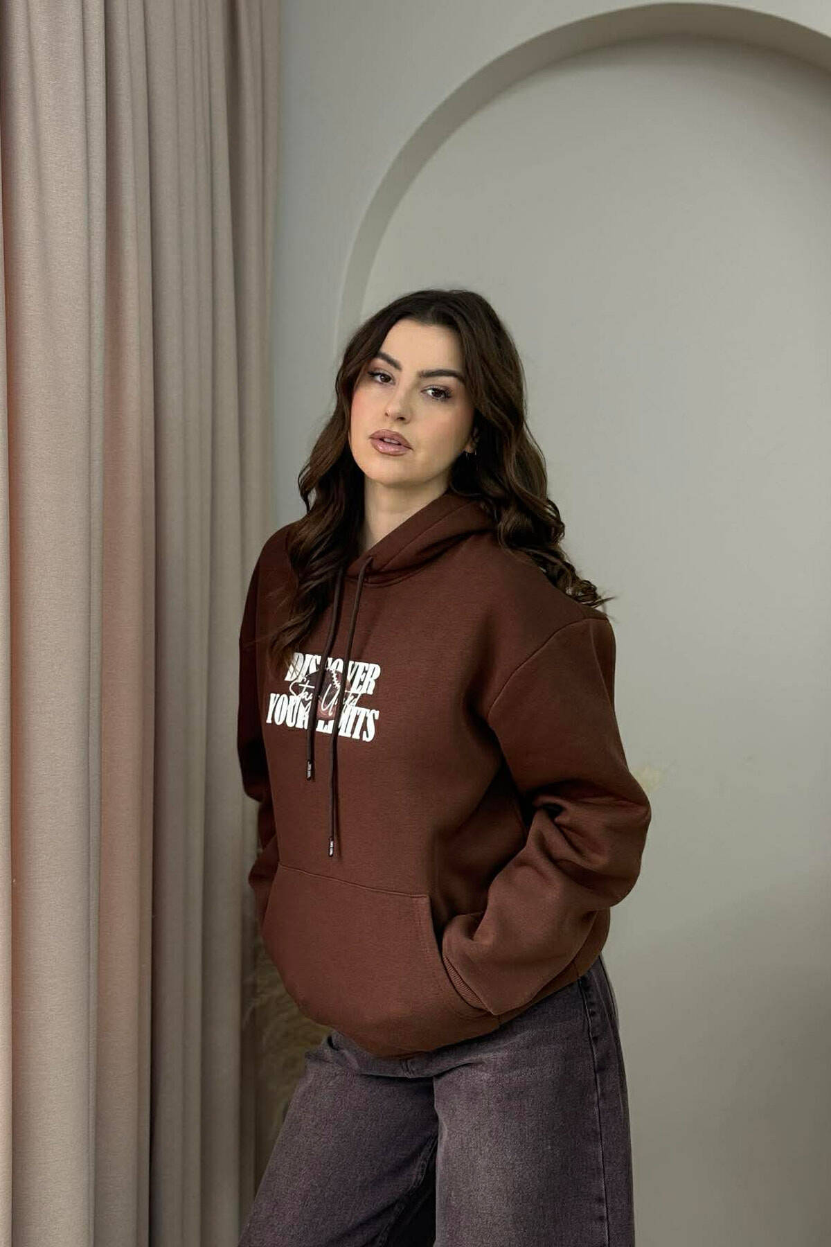 HOODIE ME PUSH DHE DIZAJN NGA TE DY ANET PER FEMRA NE NGJYRE KAFE