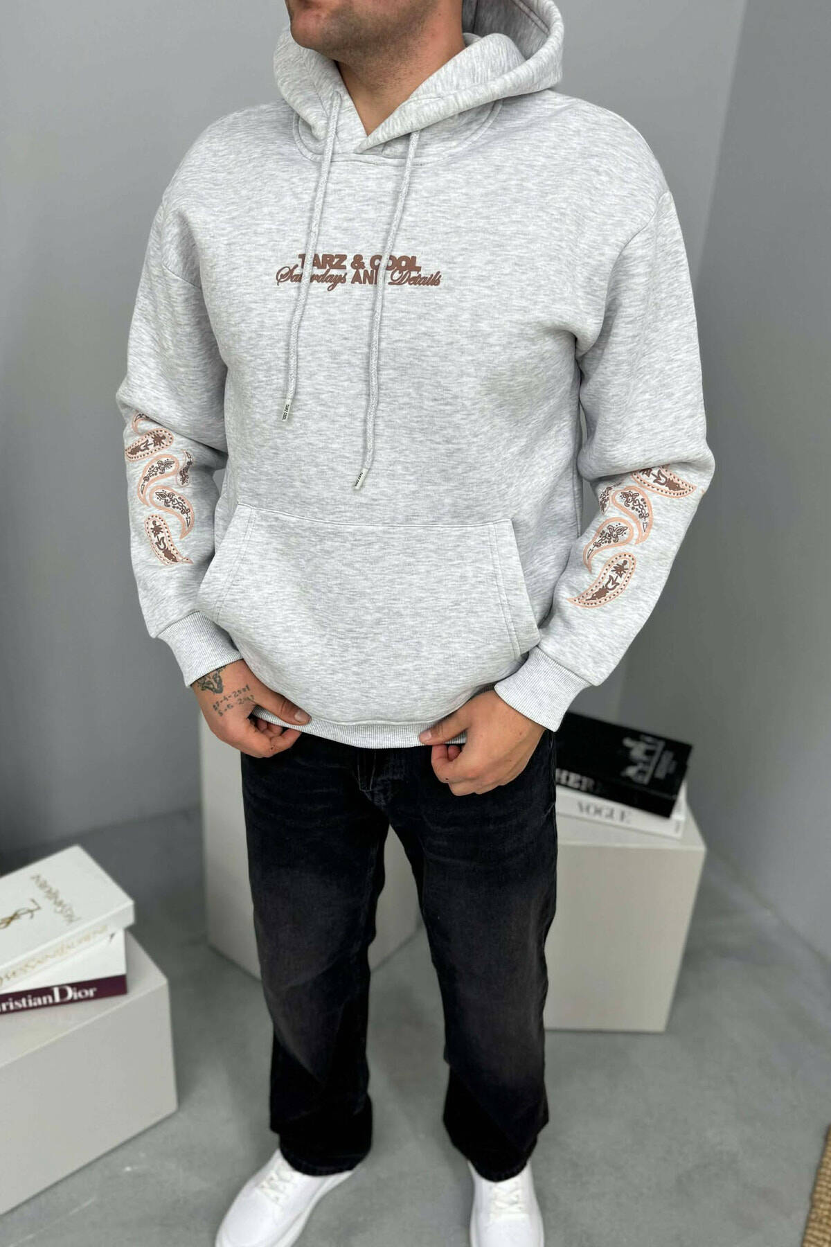 HOODIE NJE NGJYRESHE ME PUSH DHE DETAJE TE VOGLA PER MESHKUJ NE NGJYRE GRI