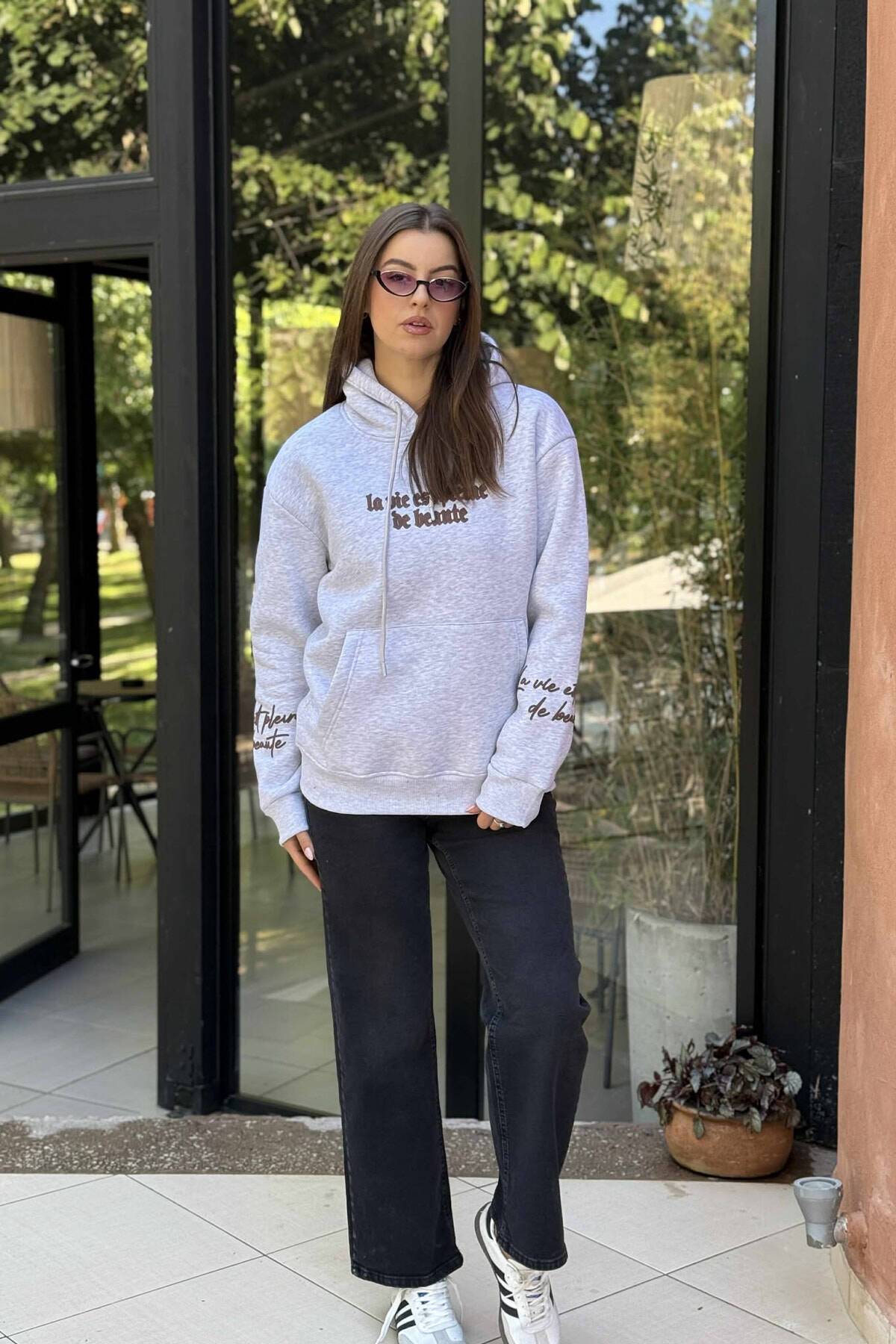 HOODIE ME PUSH NJËNGJYRËSHE DHE DIZANJ MBRAPA PËR FEMRA NË NGJYRËN GRI TË ZBARDHUR