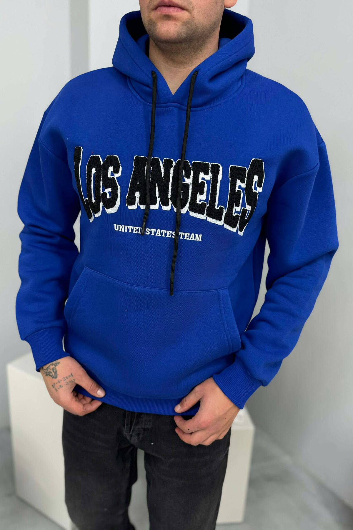HOODIE ME PUSH NJËNGJYRËSHE DHE ME SHKRIM PARA PËR MESHKUJ NË NGJYRE BLU