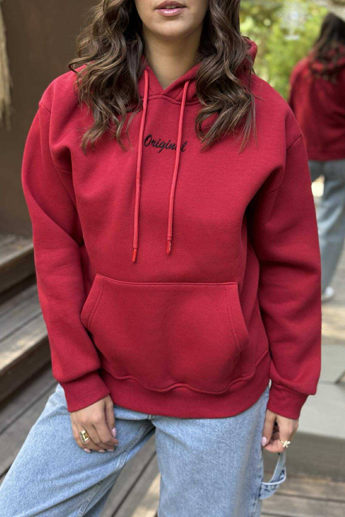 HOODIE ME PUSH NJËNGJYRËSHE DHE ME SHKRIM TË VOGËL PARA PËR FEMRA NË NGJYRËN E KUQE