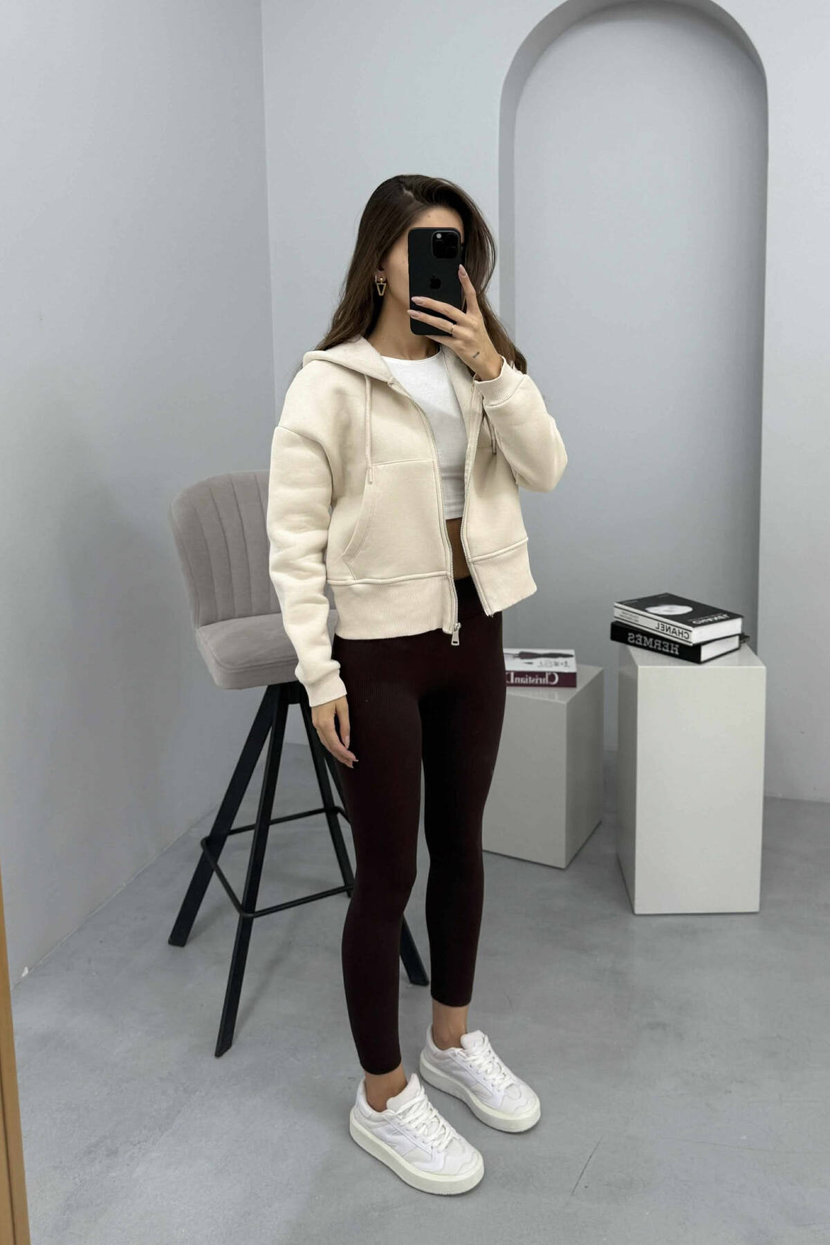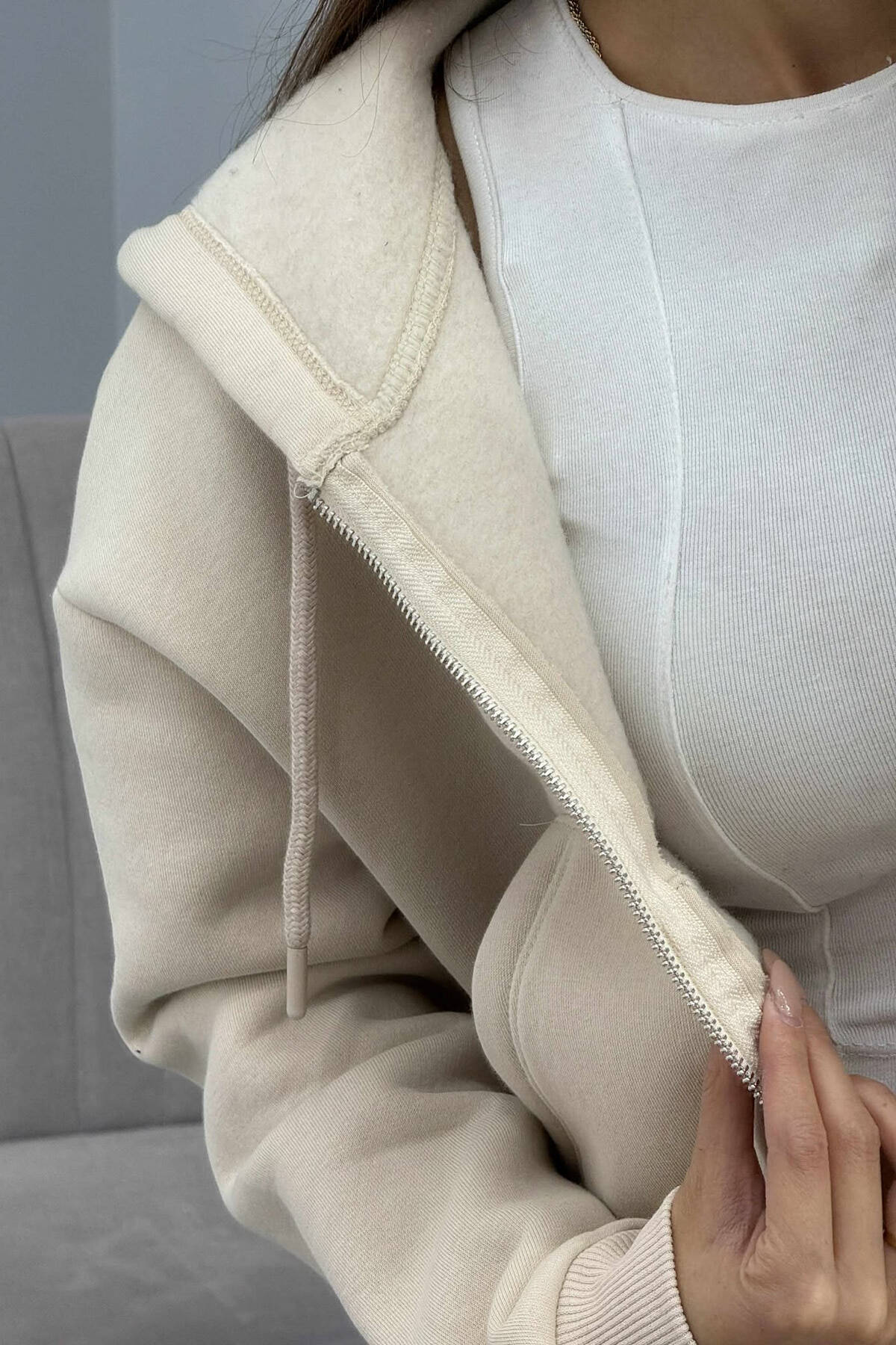 Hoodie Me Zinxhir Dhe Me Push Një Ngjyrëshe Për Femra Në Ngjyrën Krem