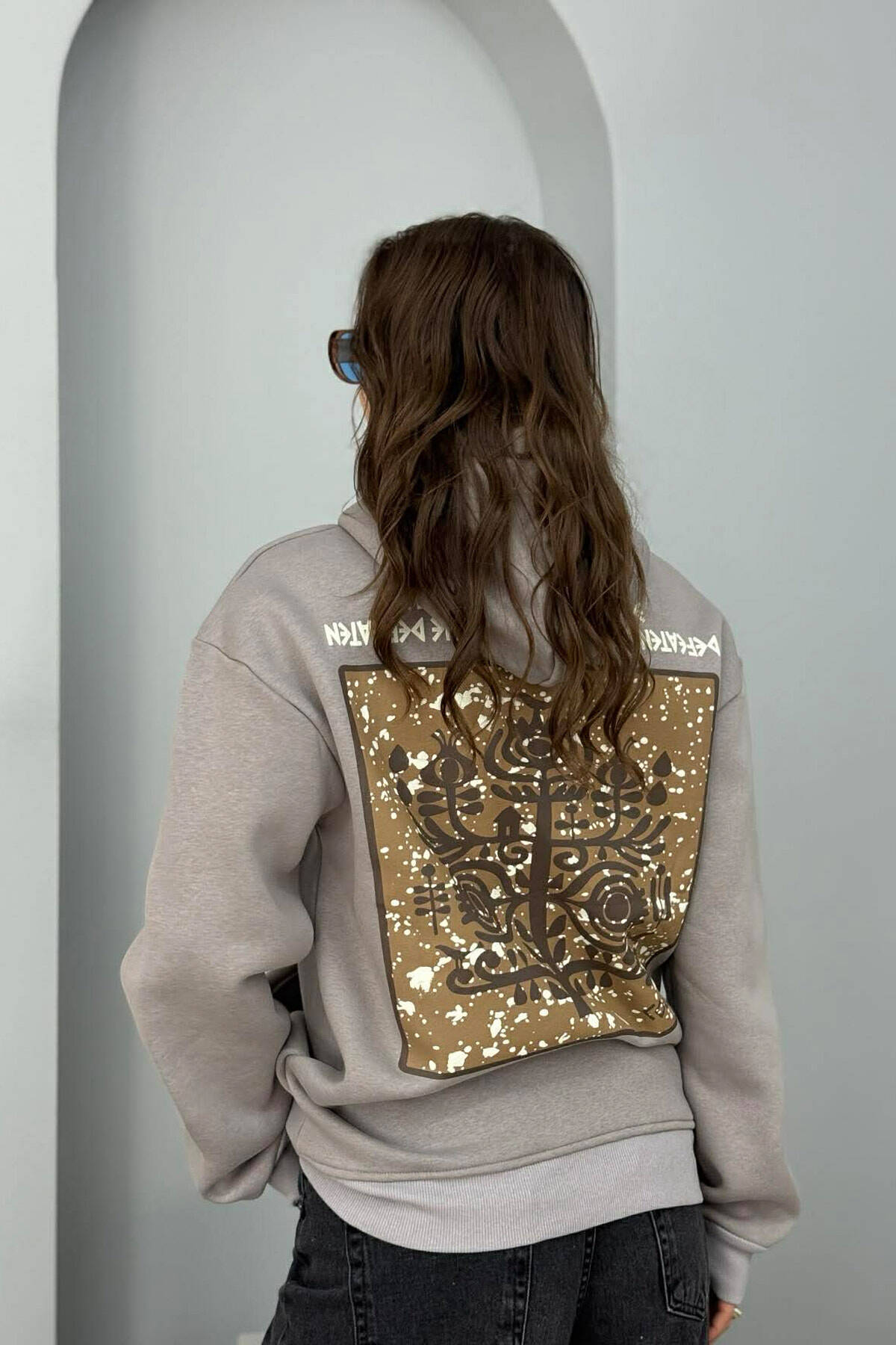 HOODIE NJE NGJYRESHE ME PUSH DHE DIZAJN NË PJESEN E PASME PER FEMRA NE NGJYRE GRI