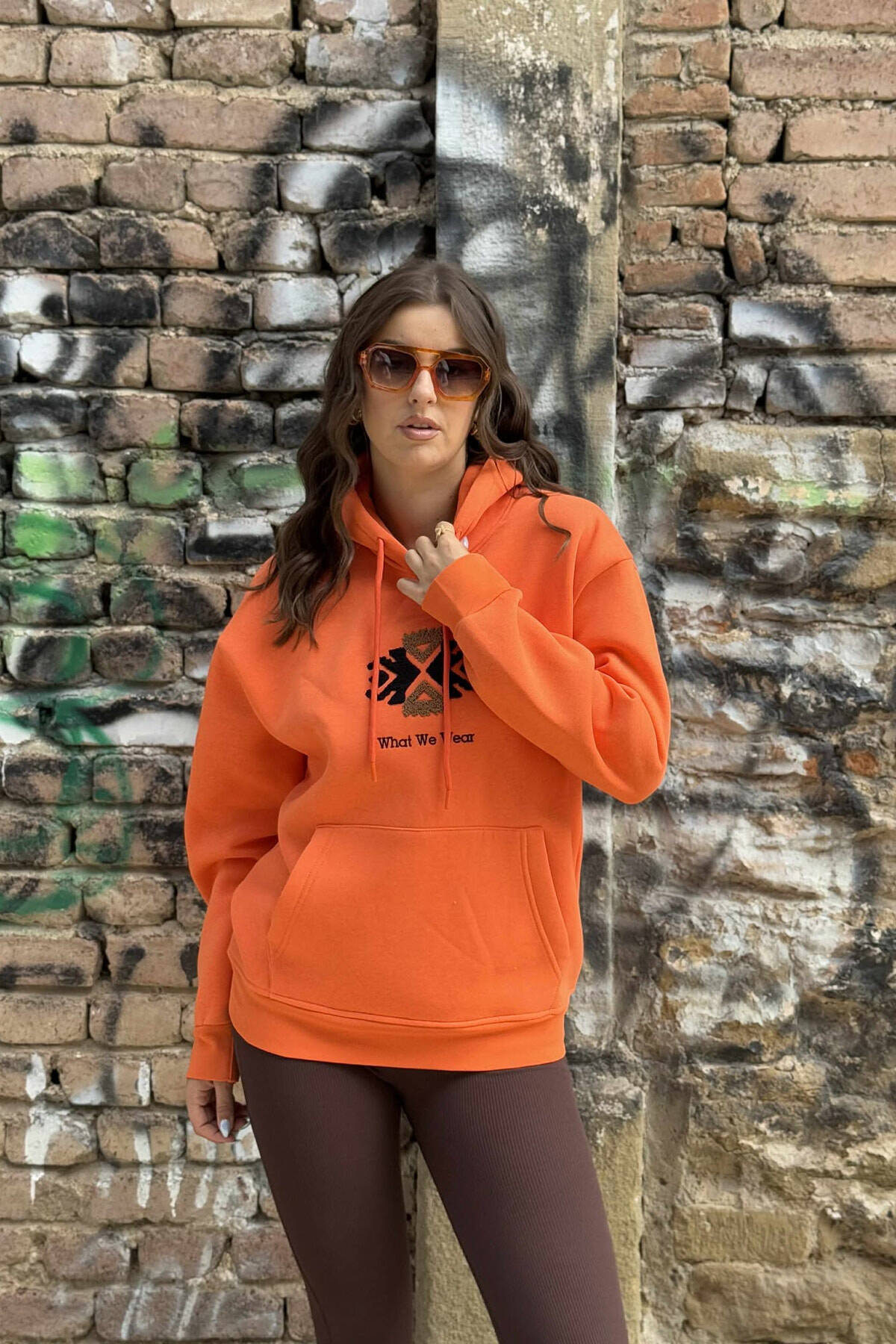 HOODIE NJË NGJYRËSHE ME PUSH DHE LOGO NË PJESËN PARA PËR FEMRA NË NGJYRË PORTOKALLI