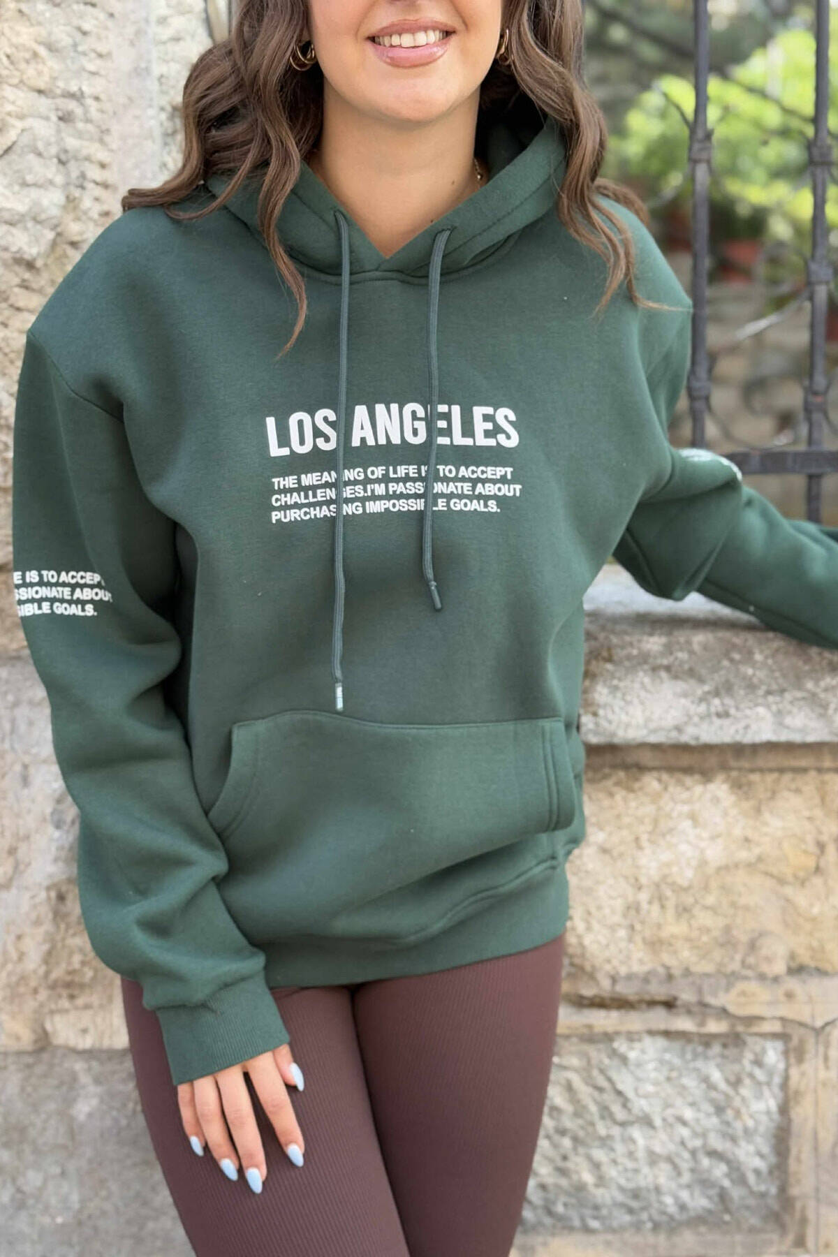 HOODIE NJË NGJYRËSHE ME PUSH DHE ME SHKRIME NË PJESËN PARA PËR FEMRA NË NGJYRËN JESHILE