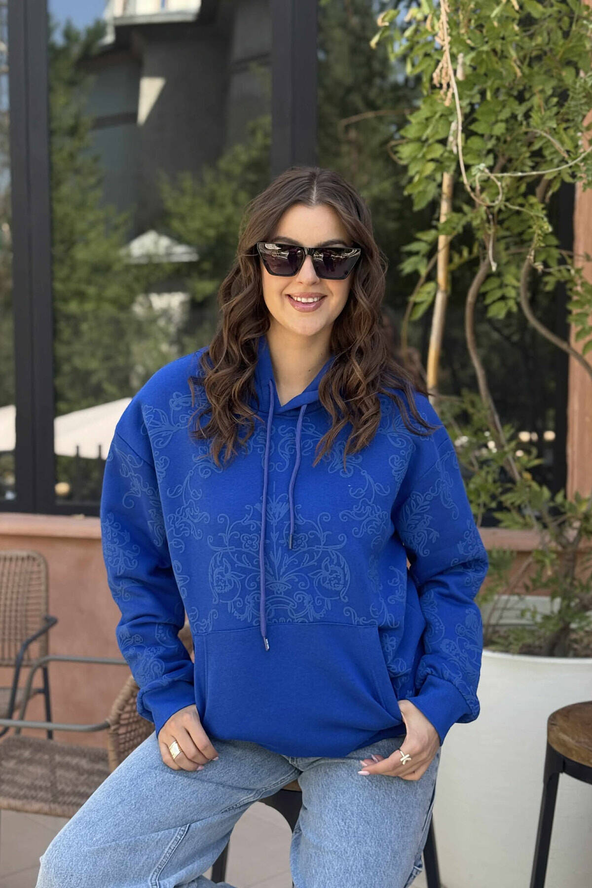 HOODIE NJËNGJJYRËSHE ME PUSH DHE DIZENJO LULESH PËR FEMRA NË NGJYRËN BLU