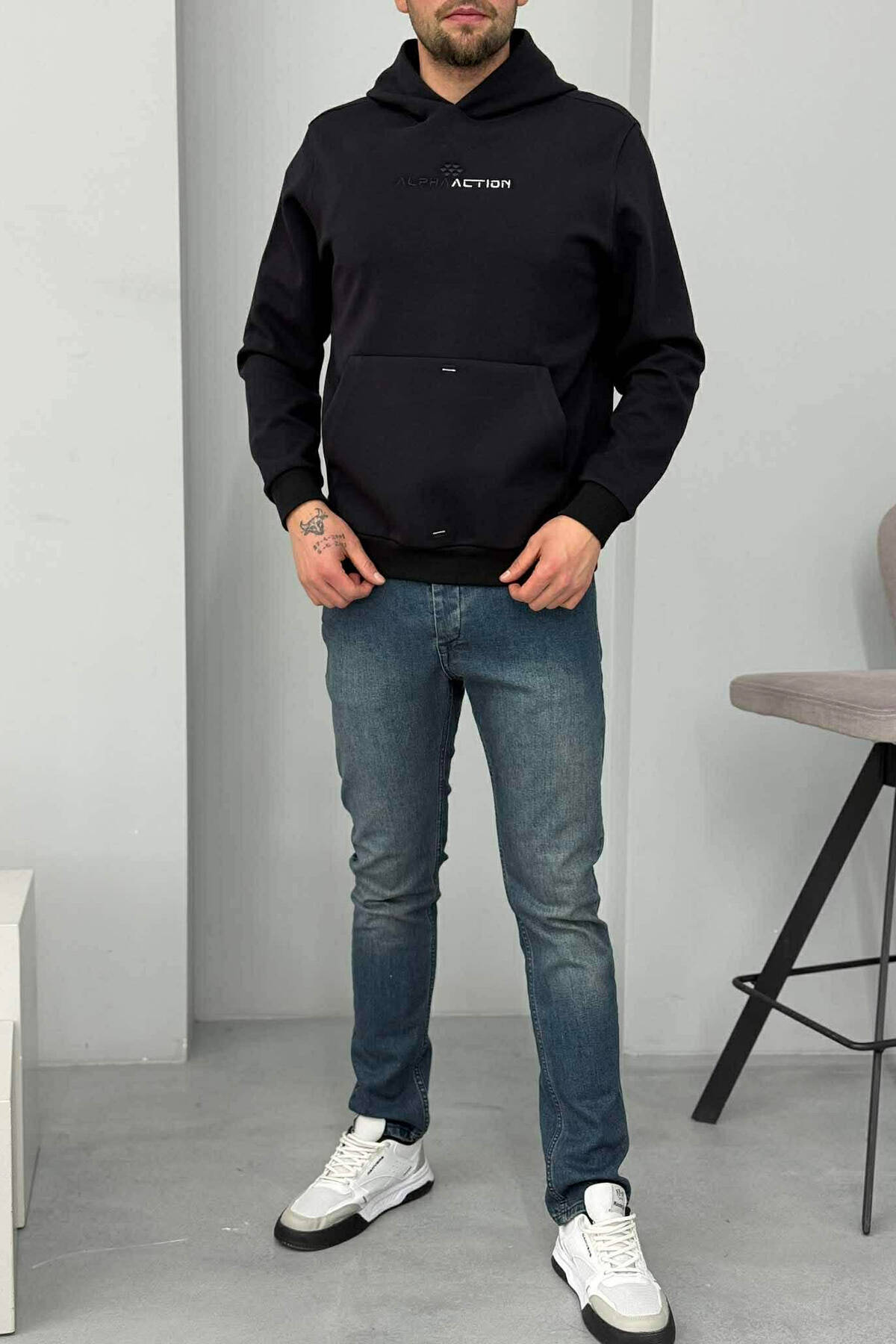 HOODIE NJË NGJYRËSHE ME LOGO NË PJESËN PARA PËR MESHKUJ NË NGJYRËN E ZEZË