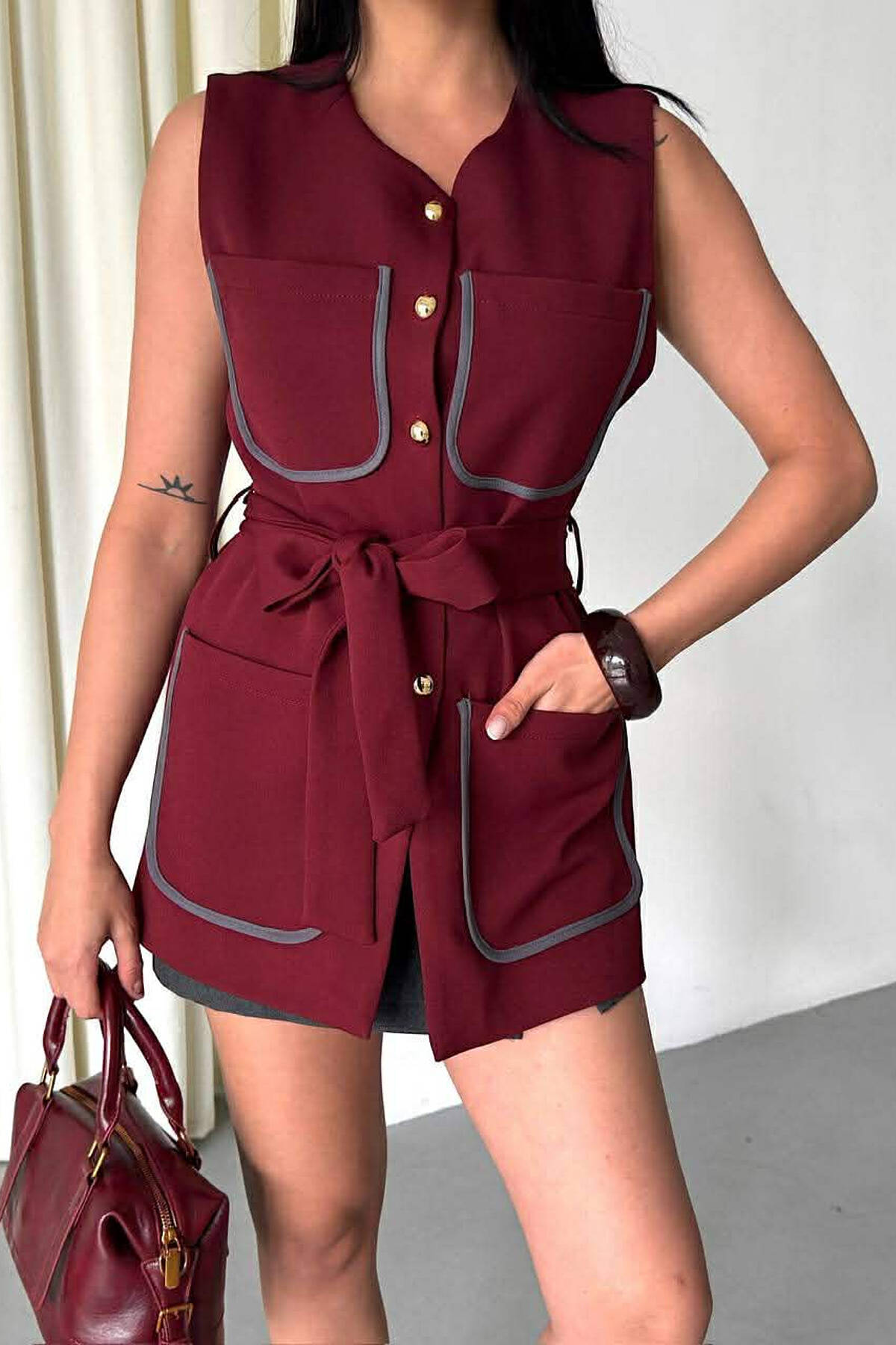 JELEK NJË NGJYRËSH ME BUTONA PËR FEMRA NË NGJYRE VISHNJE