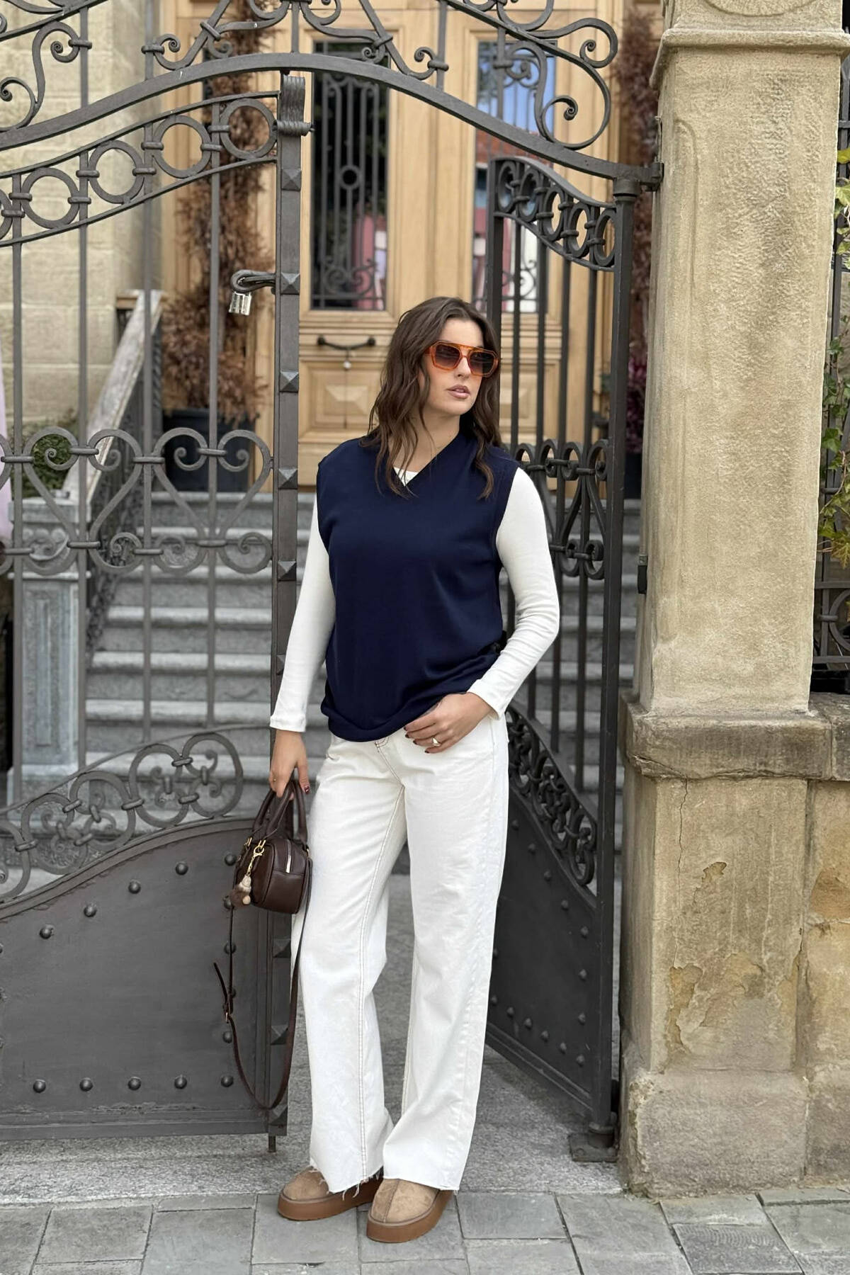 ONE COLOR KNITTED DETAILS WOMEN VEST CREAM/KREM
