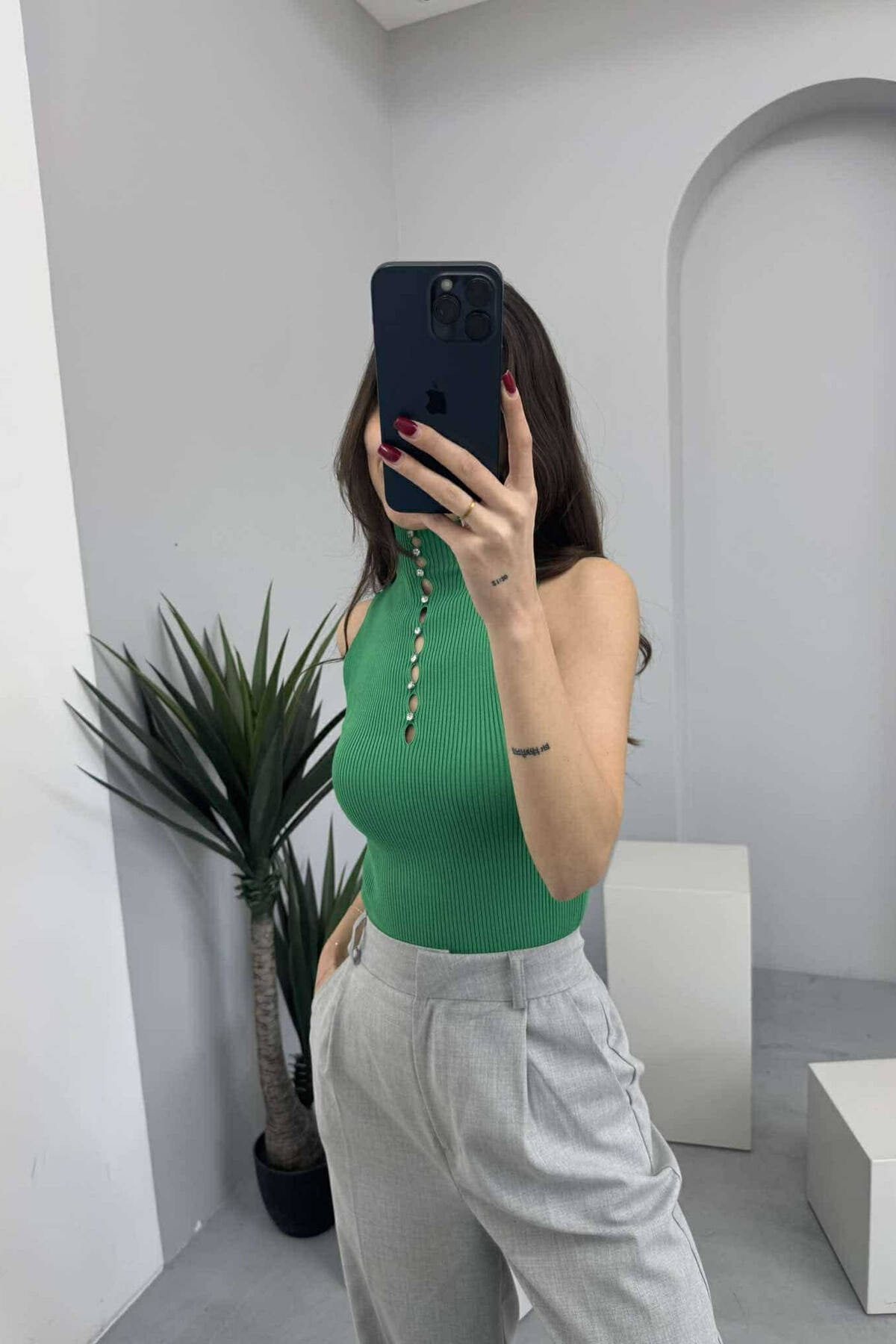 KANATJERE NJË NGJYRËSHE ME DETAJIN E GURËVE PËR FEMRA NË NGJYRËN JESHILE