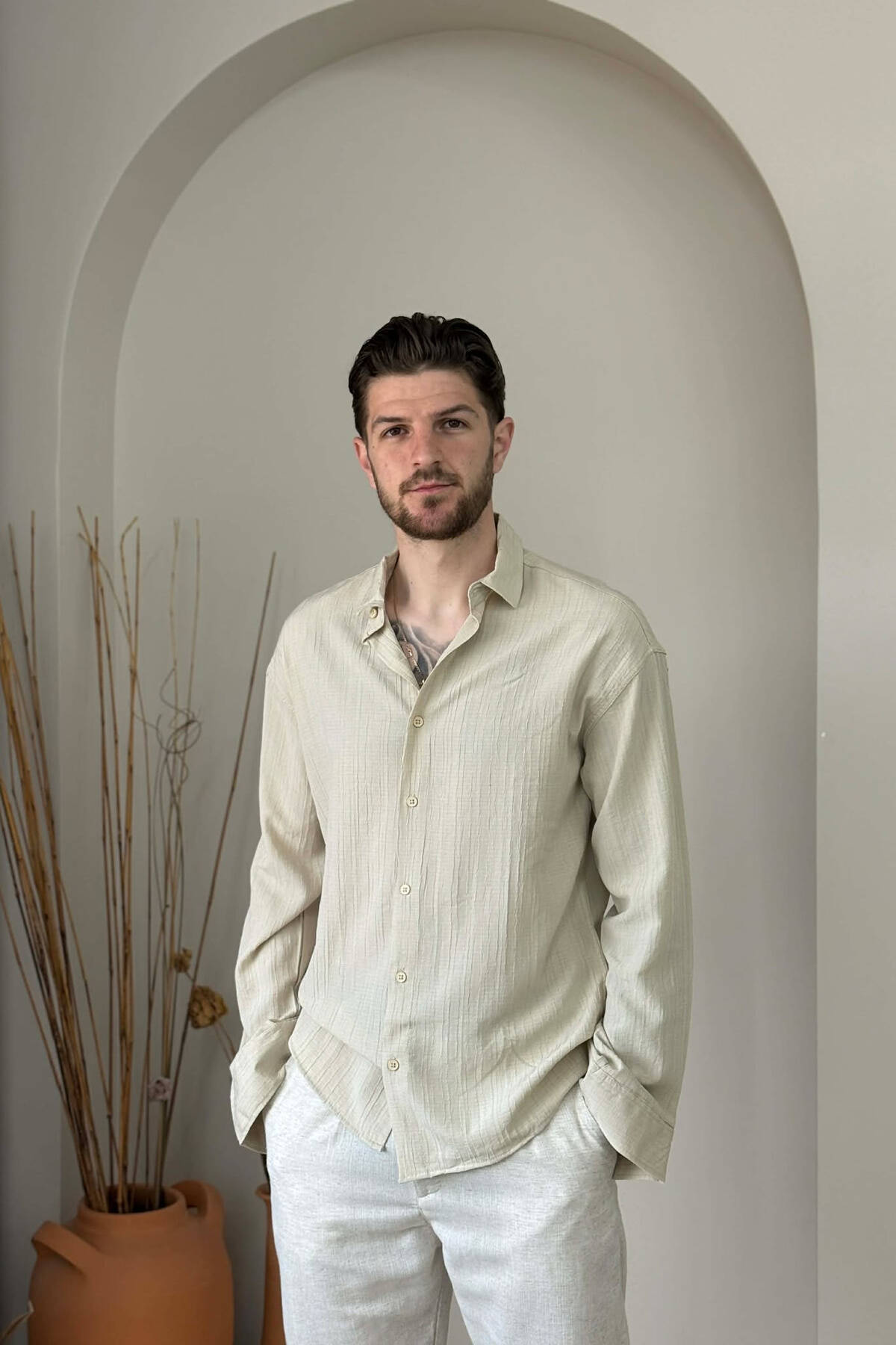 KEMISHE NJE NGJYRESHE ME TEKSTURE PER MESHKUJ NE NGJYRE KAFE TE ZBARDHUR