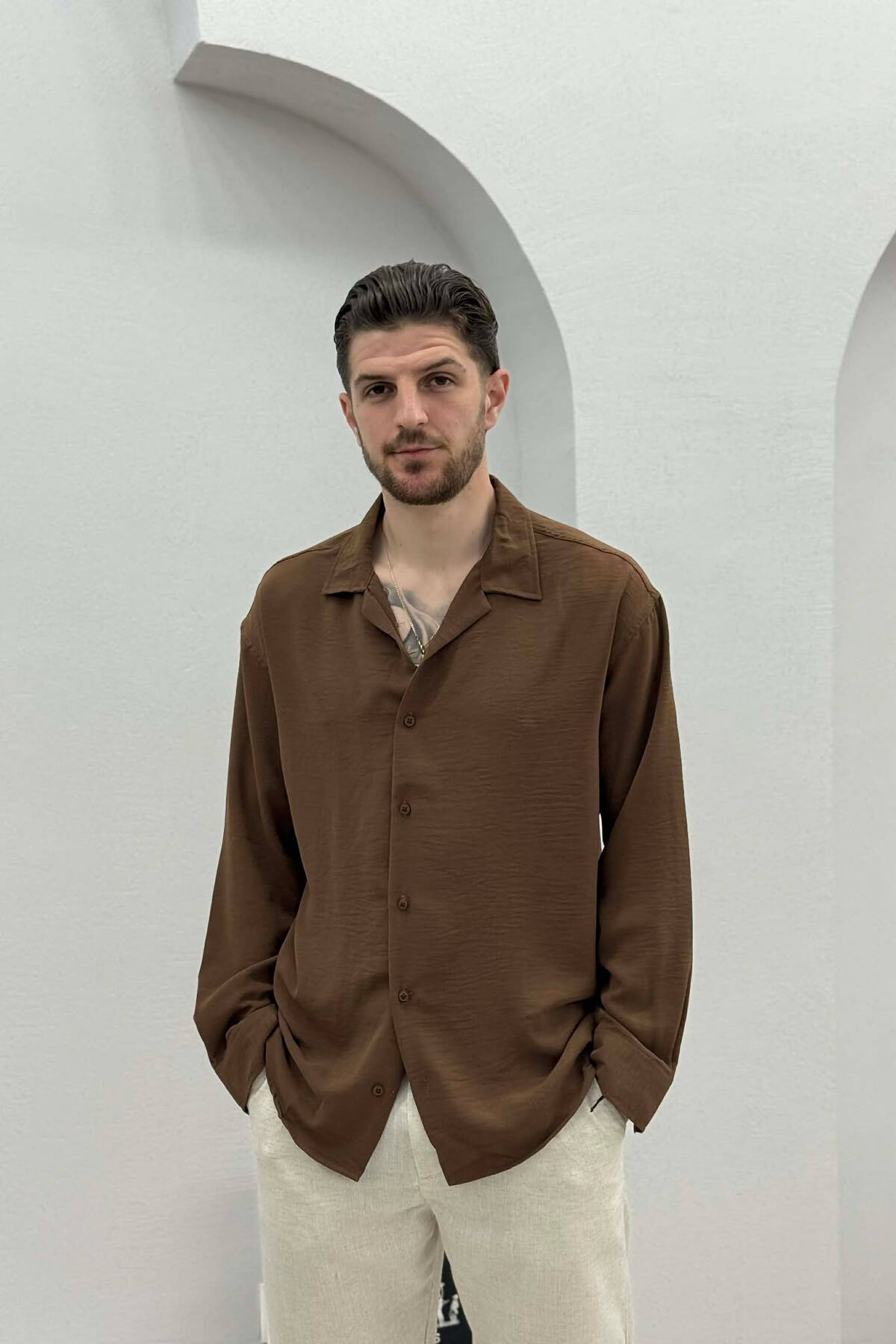KEMISHE NJE NGJYRESHE ME TEKSTURE PER MESHKUJ NE NGJYRE KAFE TE ZBARDHUR