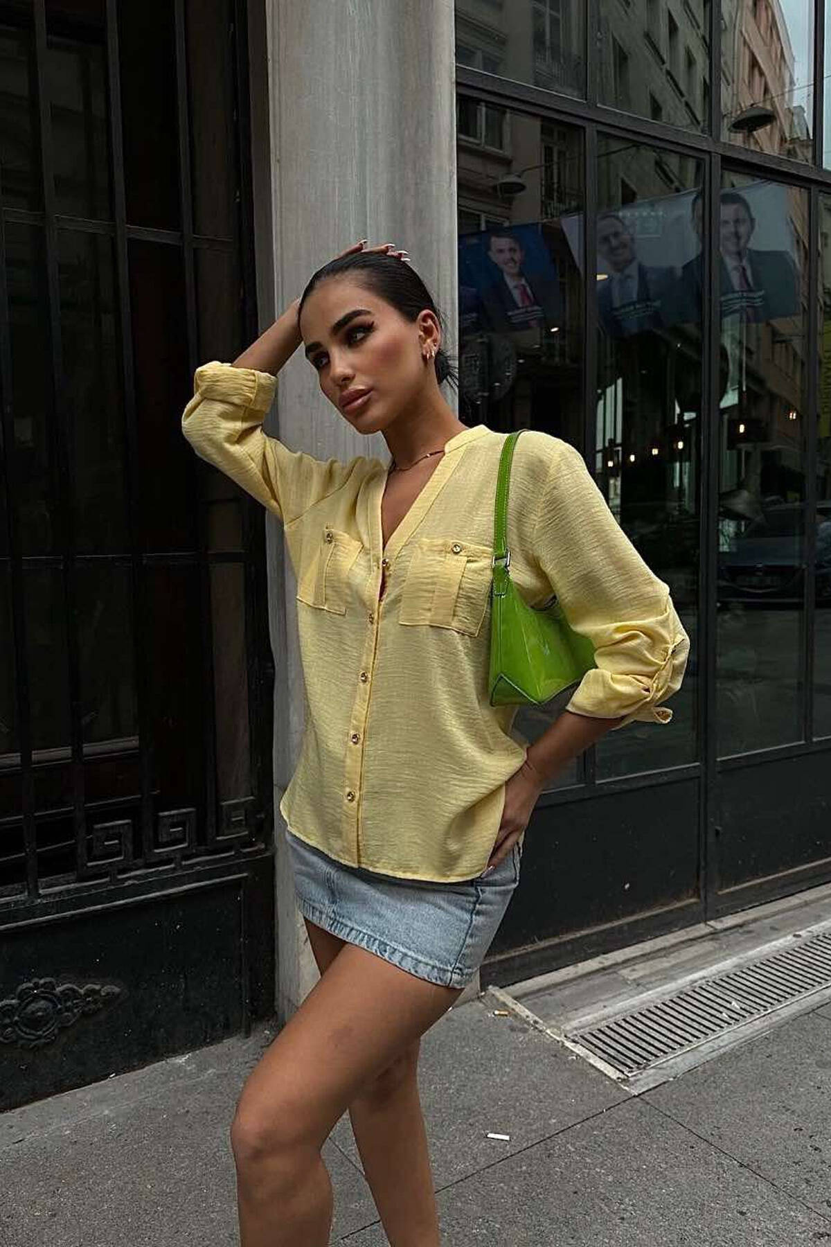 KËMISHË NJË NGJYRËSHE ME DETAJIN E KOPSAVE GOLD PËR FEMRA NË NGJYRËN E VERDHË