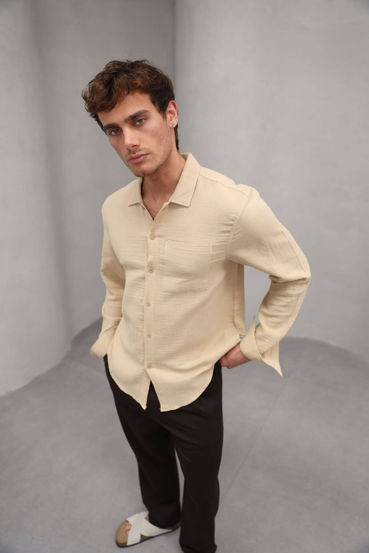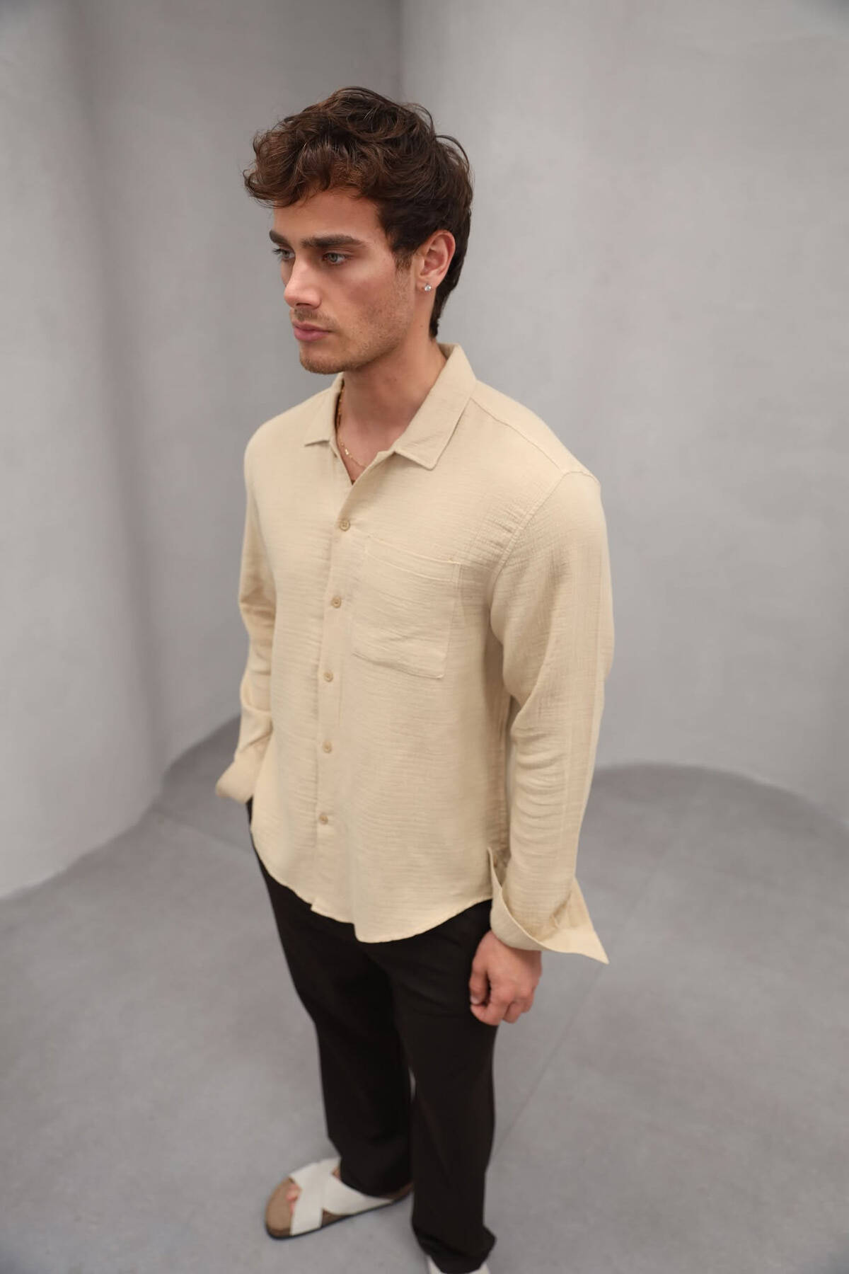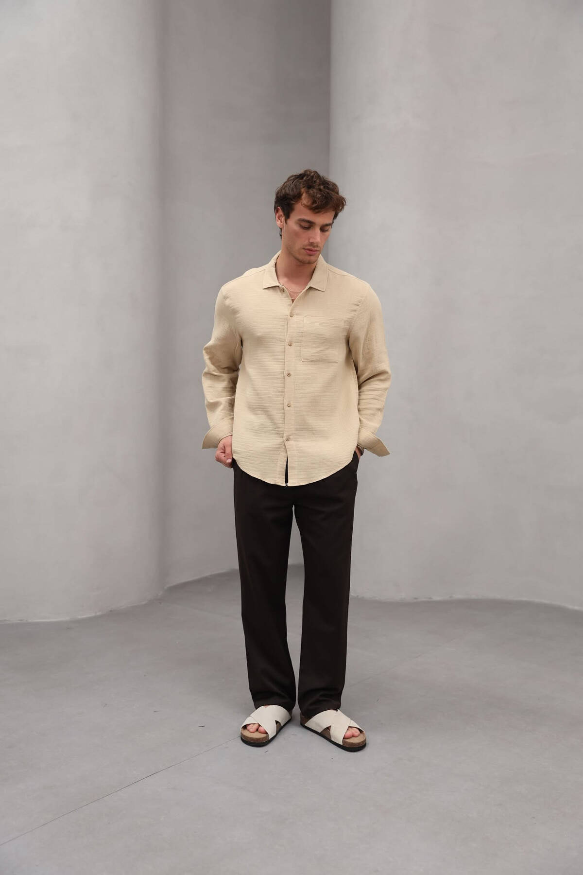 KËMISHË NJË NGJYRËSHE ME XHEP PËR MESHKUJ NË NGJYRËN BEZHË