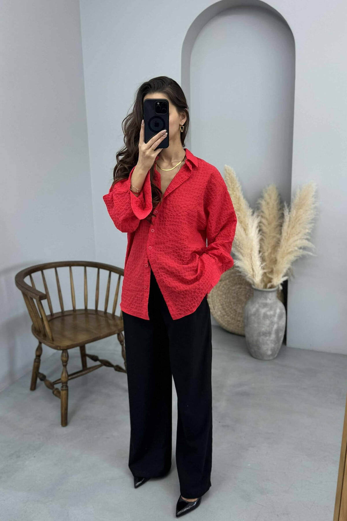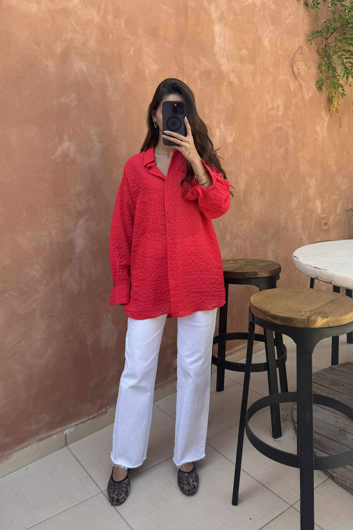 KËMISHË NJËNGJYRËSHE ME DETAJIN E NJË XHEPI PËR FEMRA NË NGJYRËN E KUQE