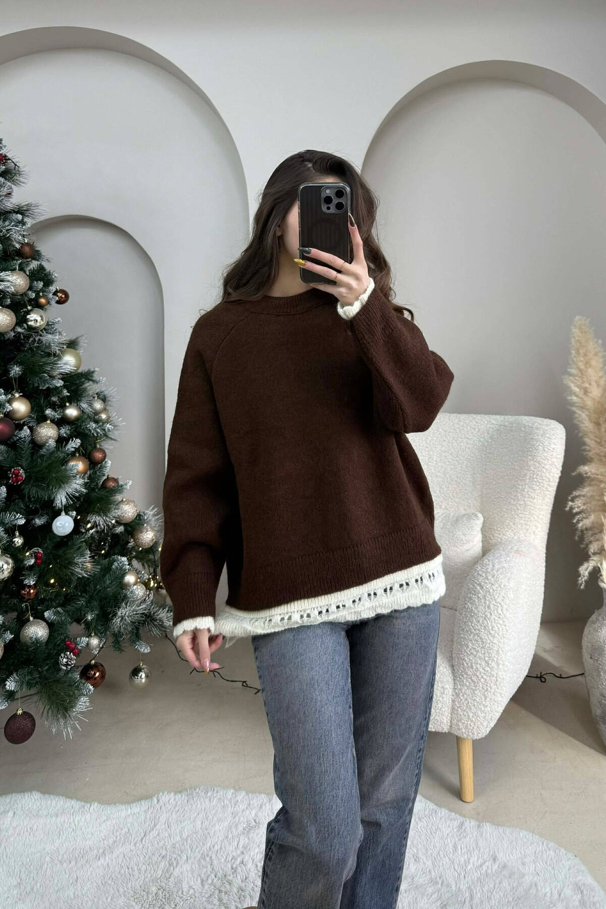 ONE COLOR LACE DETAIL WOMAN SWEATER BROWN/KAFE