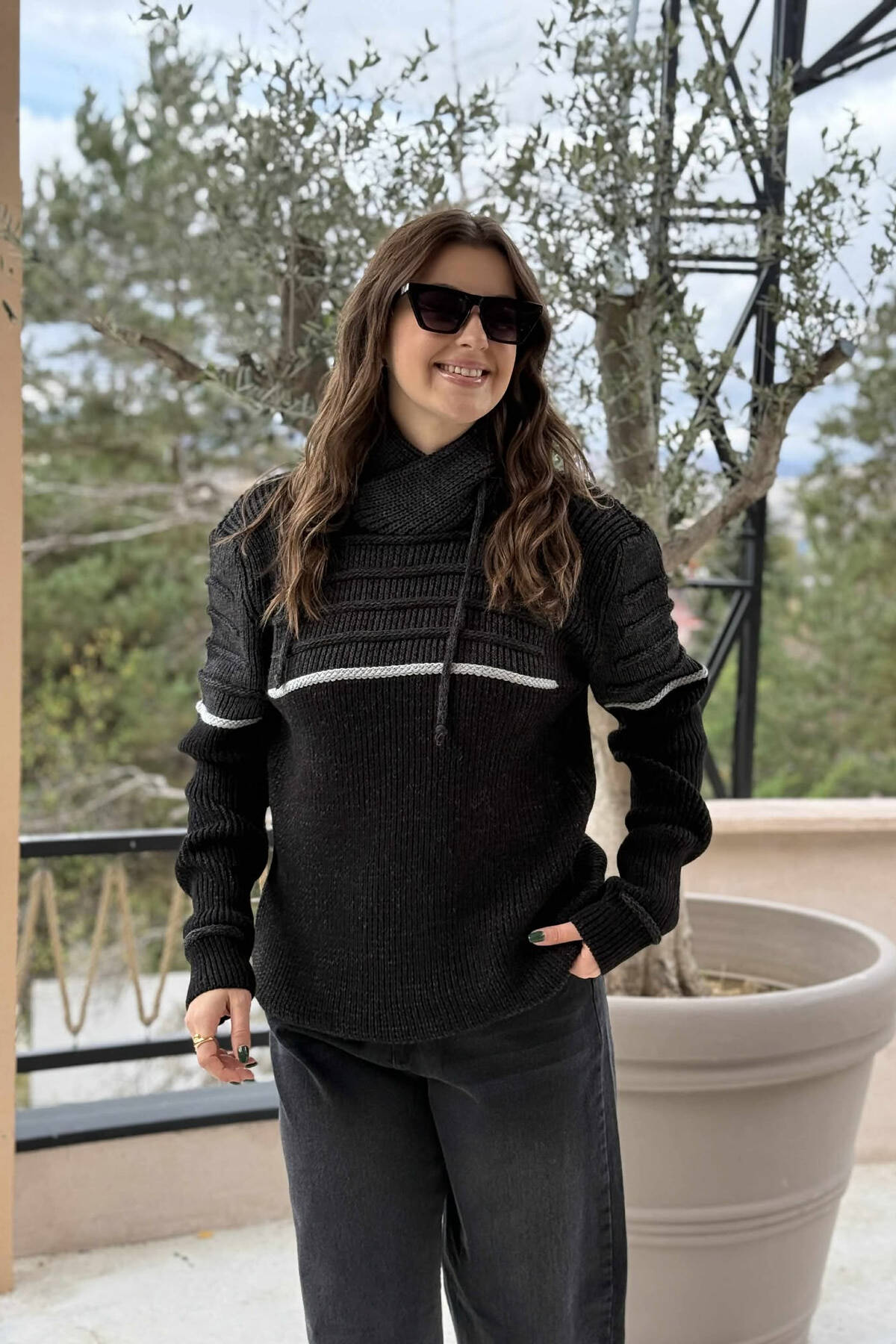 KNITTED HIGH NECK LACING WOMEN SWEATER BLACK/ E ZEZE