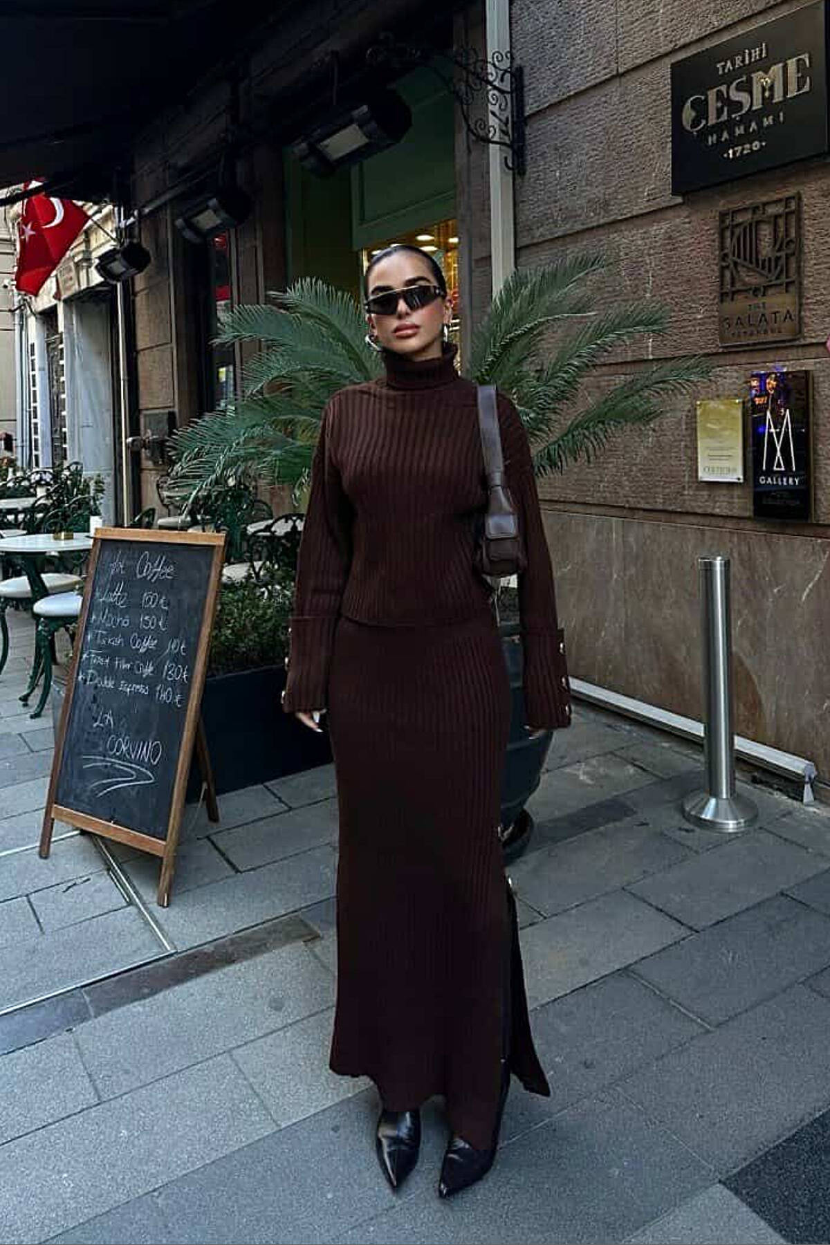 KNITTED HIGH NECK SWEATER+SKIRT WOMEN SET BROWN/KAFE