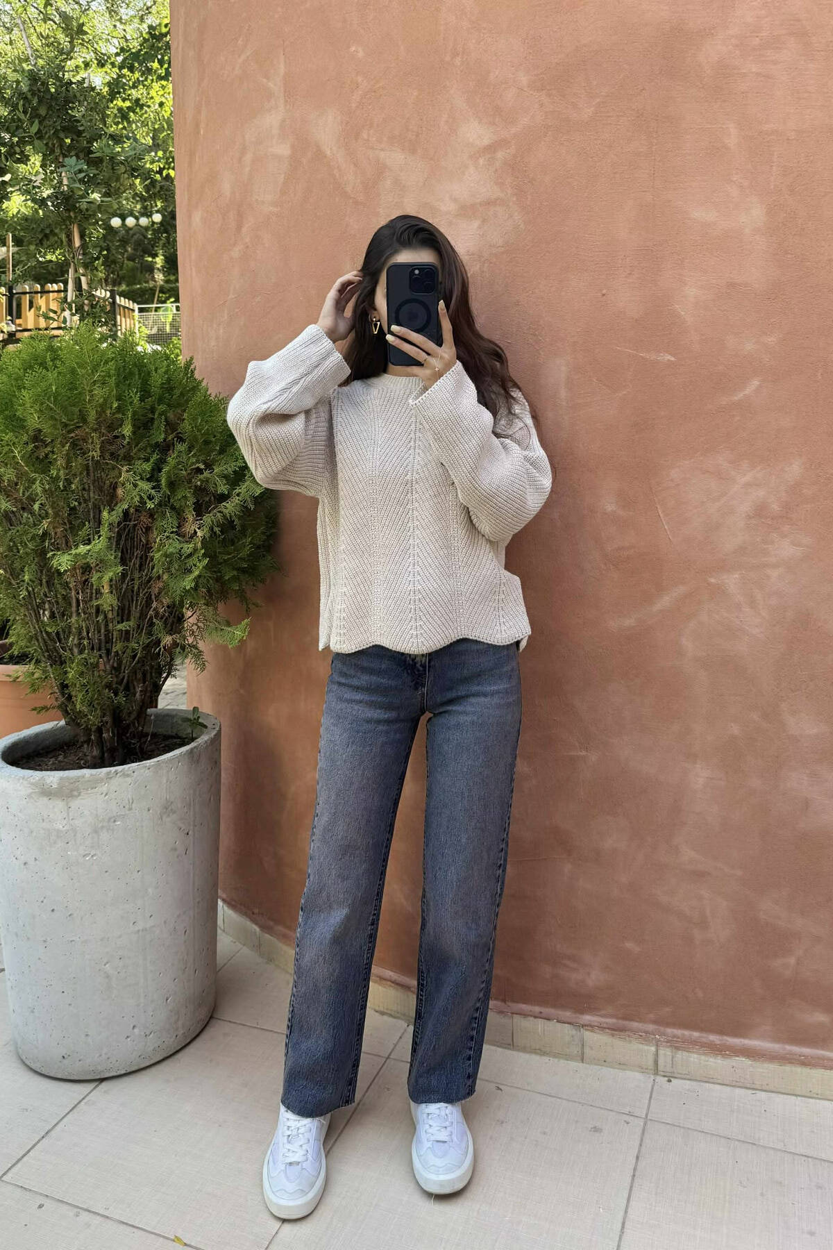 KNITTED ONE COLOR SIMPLE WOMEN SWEATER LIGHT BEIGE/BZHZB