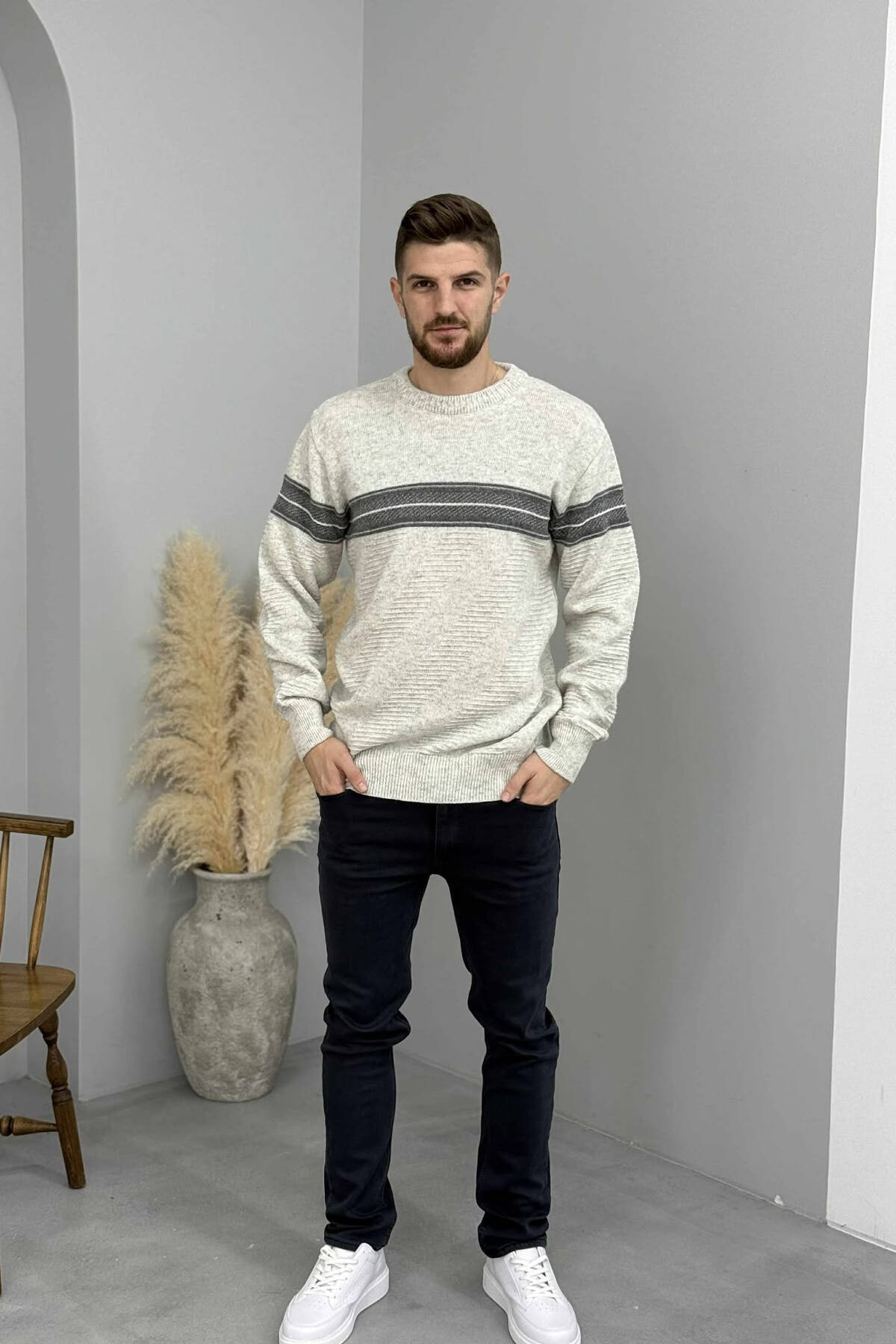 SIMPLE KNITTED STRIPES MEN SWEATER GREY/GRI