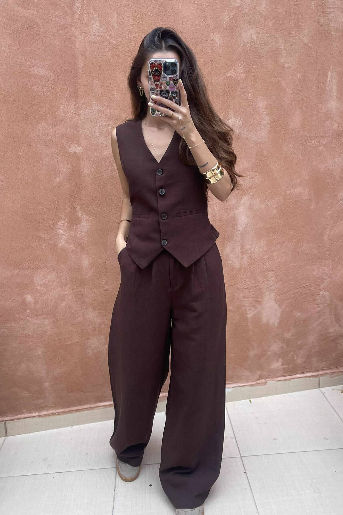 SET NJË NGJYRËSH JELEK+PANTALLONA PËR FEMRA NË NGJYRË KAFE