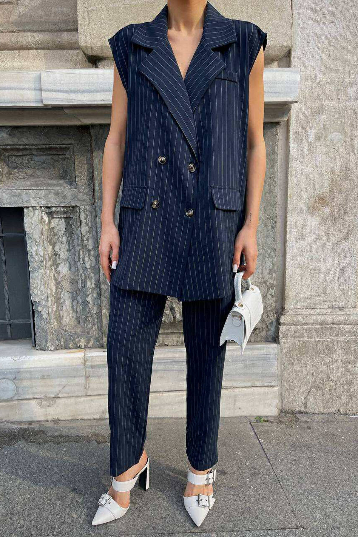KOSTUM I THJESHTE NJË NGJYRËSH JELEK +PANTALLONA ME VIJA PËR FEMRA NË NGJYRËN BLU E ERRËT