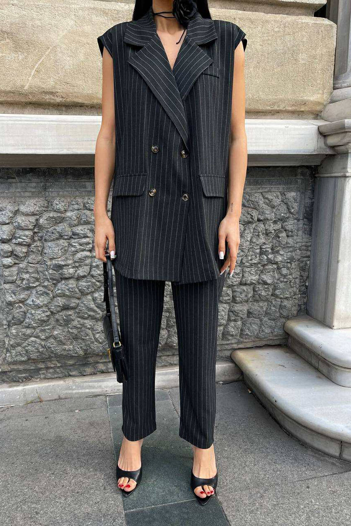 KOSTUM I THJESHTE NJË NGJYRËSH JELEK +PANTALLONA ME VIJA PËR FEMRA NË NGJYRËN GRI E ERRËT