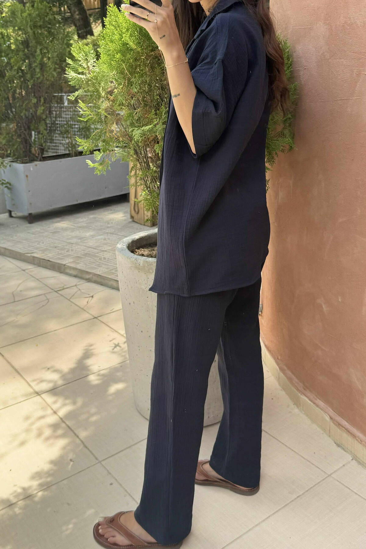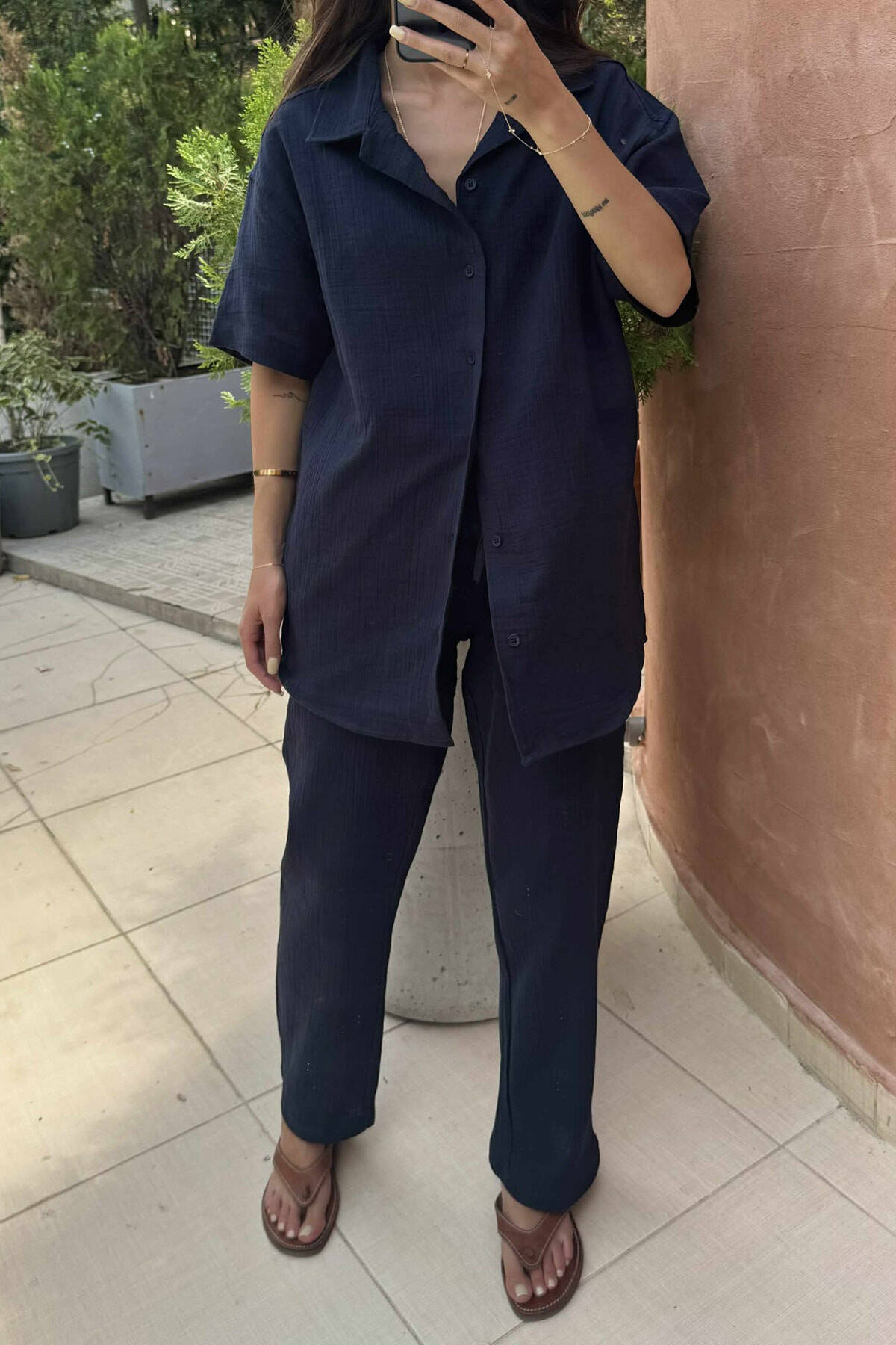 KOSTUM KËMISHË ME MËNGË TË SHKURTRA+PANTALLONA PËR FEMRA NË NGJYRËN BLU TË ERRËT
