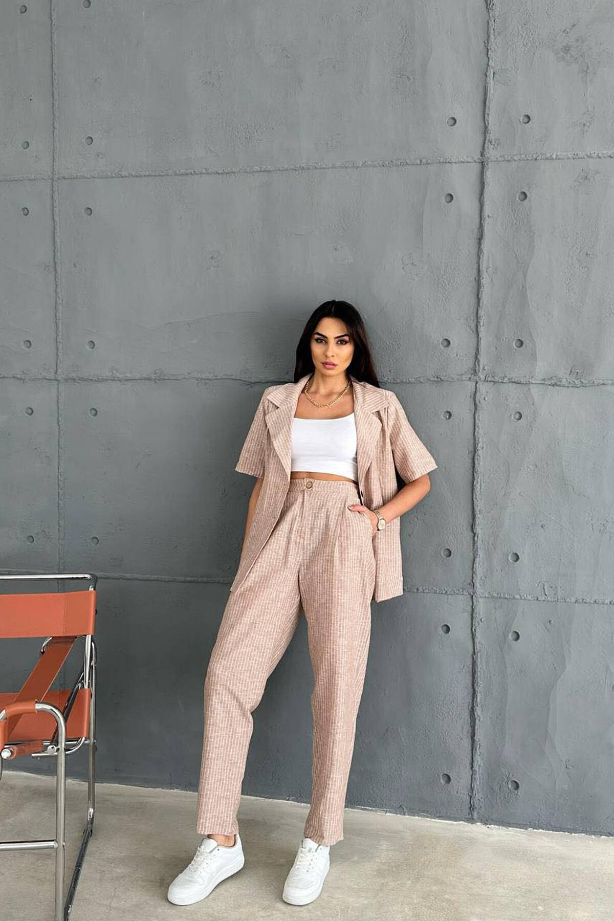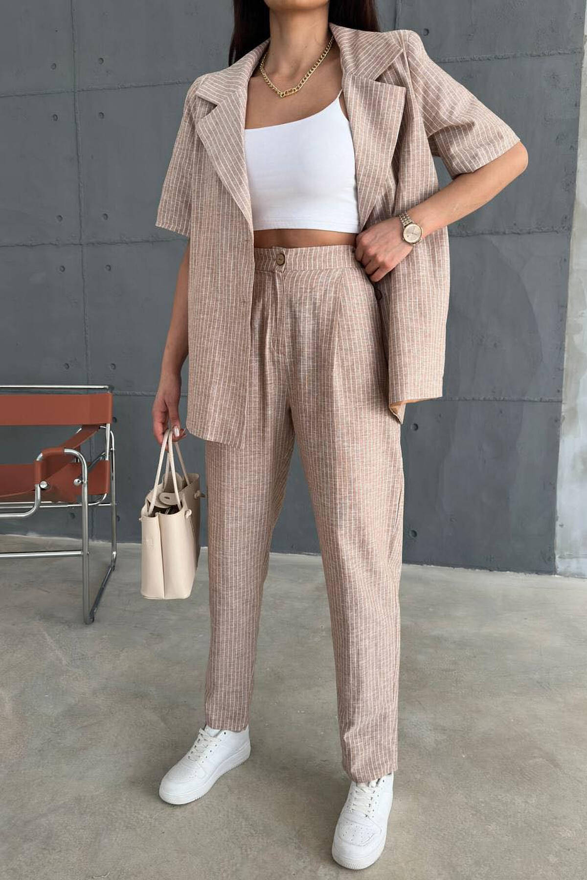 Kostumi eshte me pantallona dhe xhakete. Xhaketa eshte me menge te shkurtra me detajin e kopsave dhe nje rripi ne bel. Kostumi perfshin elegancen dhe komoditetin ne te njejten kohe.