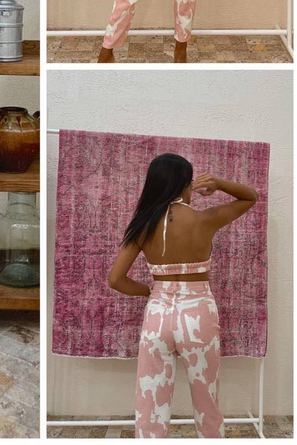 Kostumi eshte me pantallona te gjata dhe crop, ka material te plote dhe me motive ne ngjyren krem.