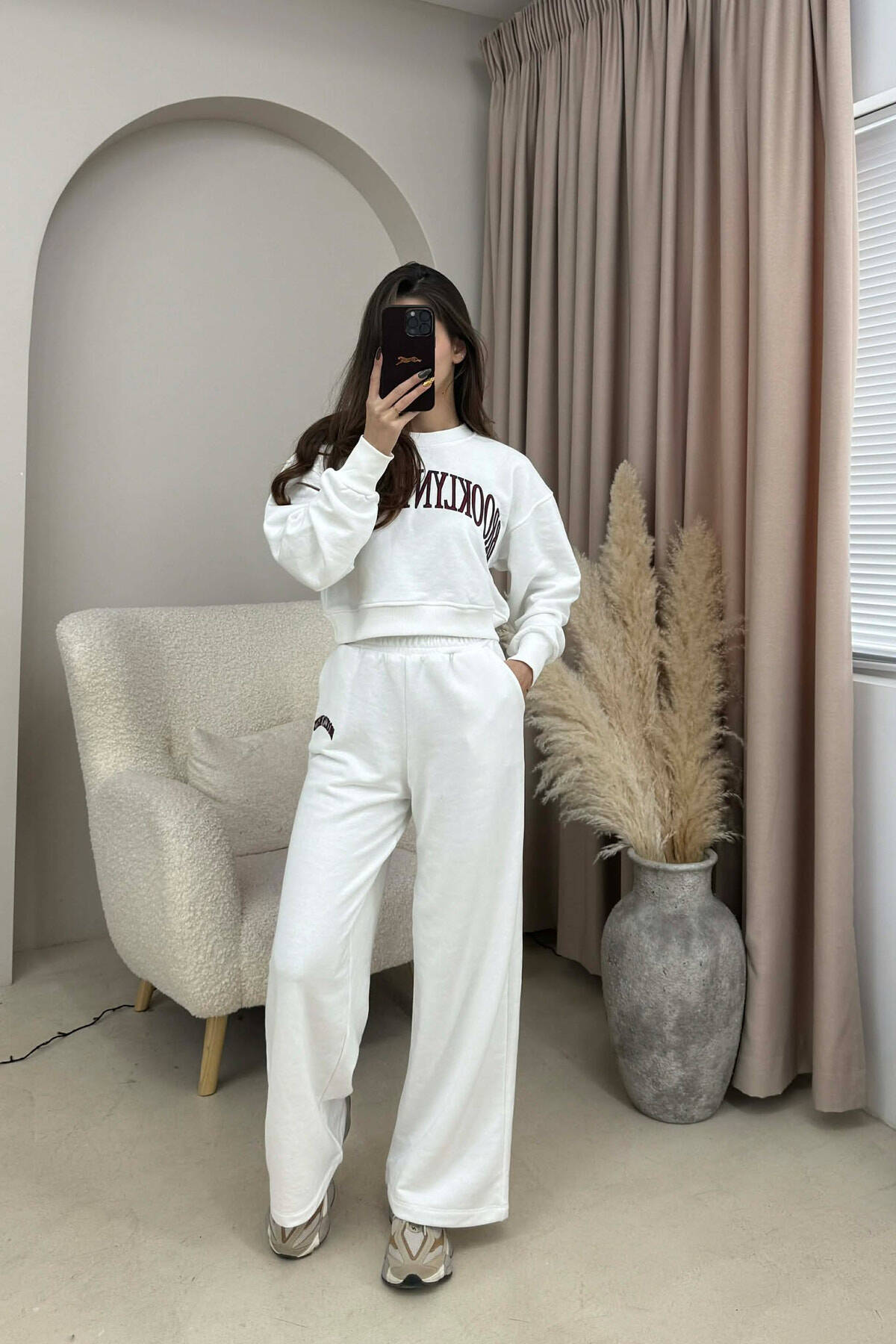 KOSTUM ME SHKRIME BLUZË E SHKURTËR+TUTA PËR FEMRA NË NGJYRË TË BARDHË