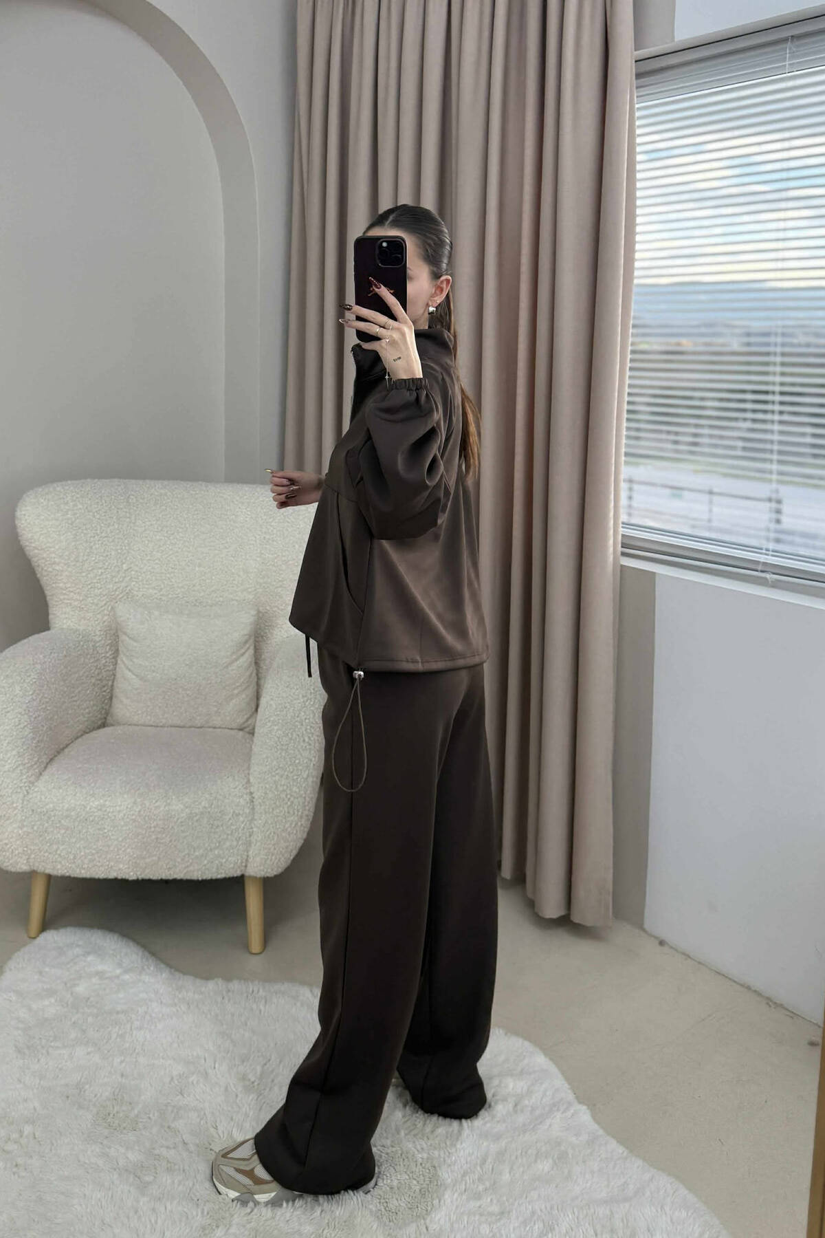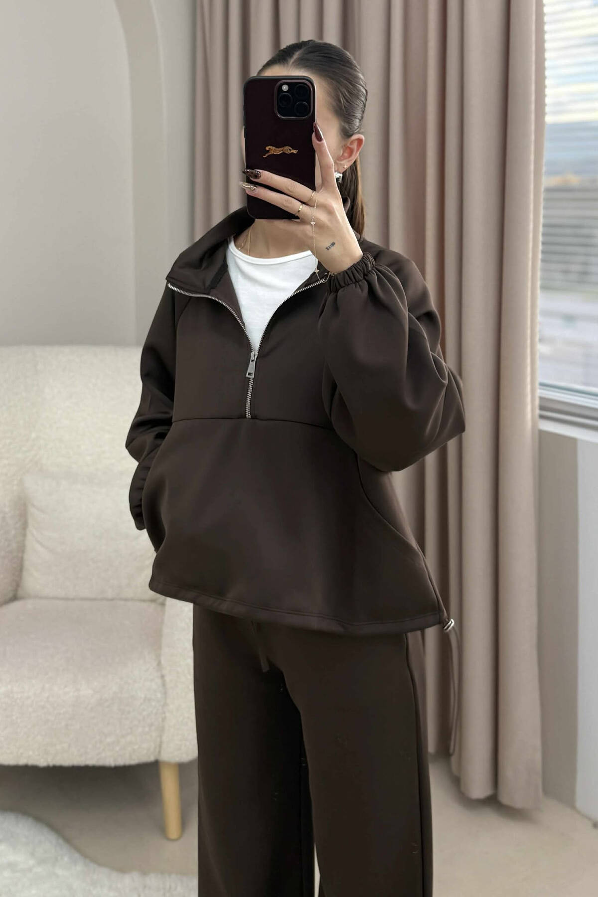 KOSTUM NJE NGJYRESH BLUZE ME JAKE ME ZINXHIR+TUTA PER FEMRA NE NGJYRE KAFE TE ERRET