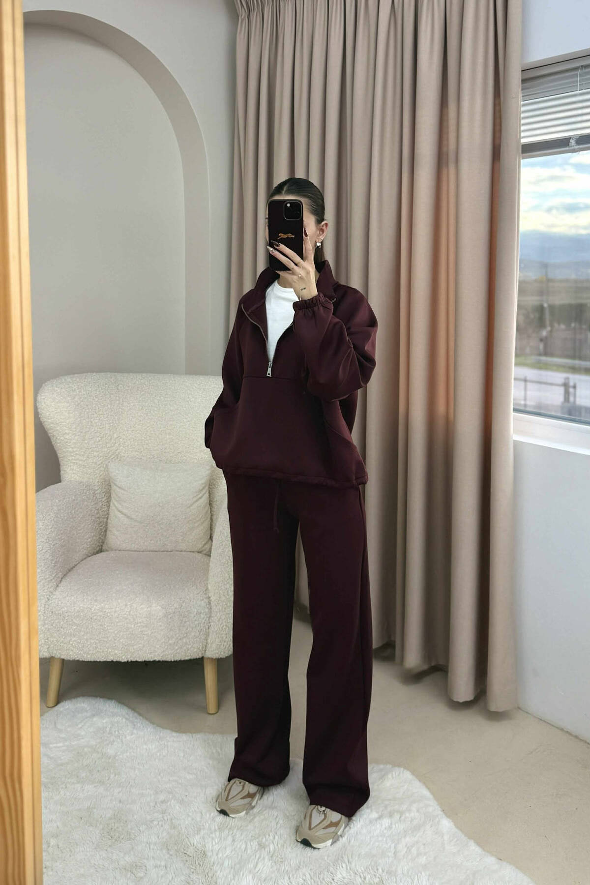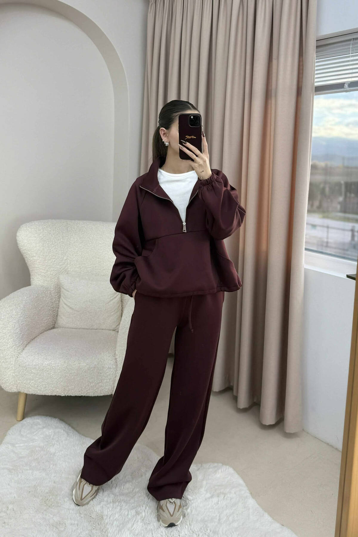 KOSTUM NJE NGJYRESH BLUZE ME JAKE ME ZINXHIR+TUTA PER FEMRA NE NGJYRE VISHNJE