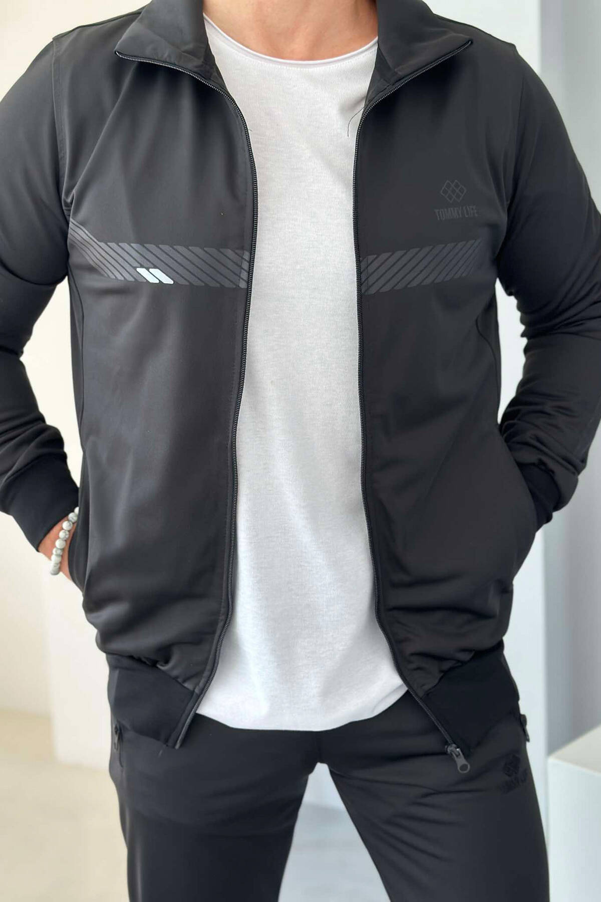 Kostum me : xhakete me mbërthim të përparmë me zinxhir dhe me detajet e dy xhepave , tutat gjithashtu vijne me dy xhepa anesorë me zinxhir në një prerje të drejtë , ndërthurja e këtyre elementëve e bën padyshim kostumin mjaf komod dhe me stil.