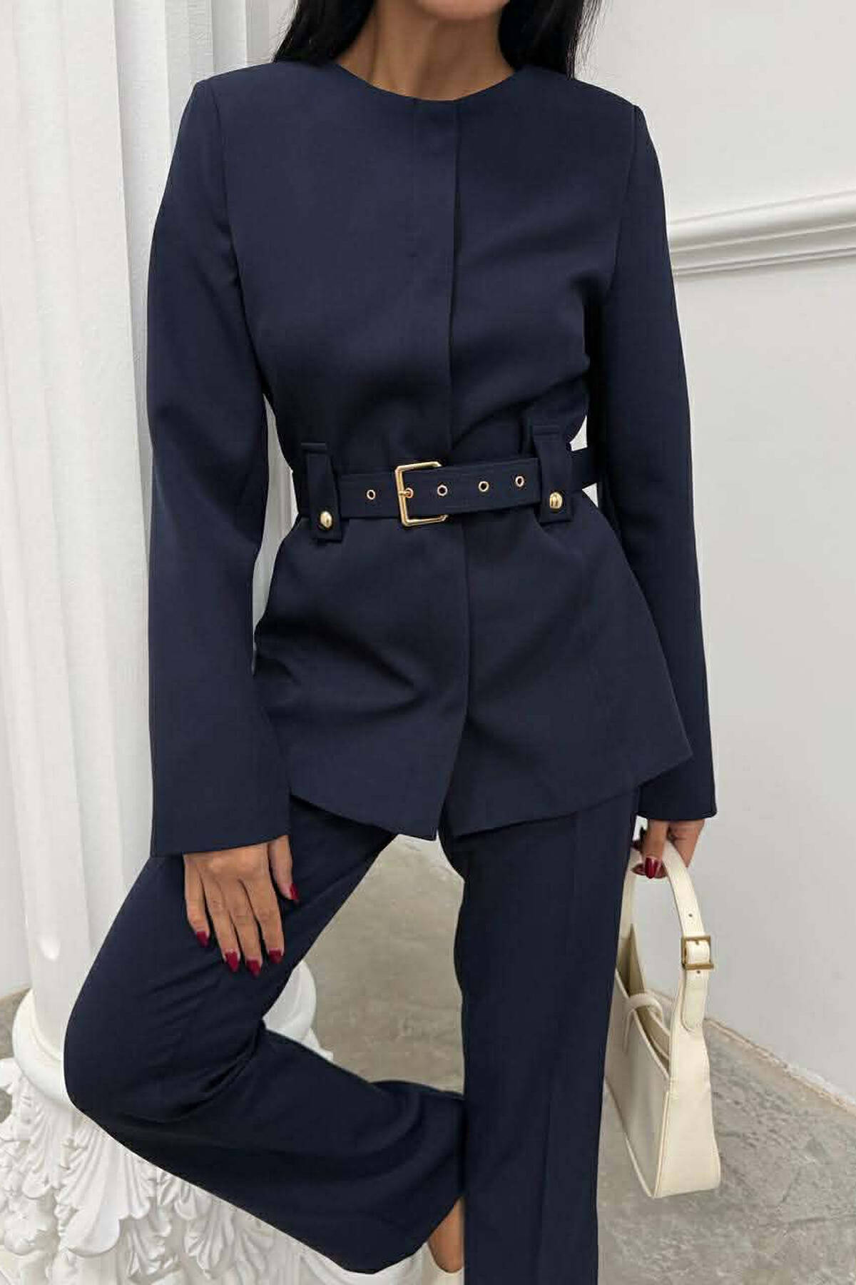 KOSTUM NJË NGJYRËSH XHAKETË ME RRIP+PANTALLONA PËR FEMRA NË NGJYRE BLU