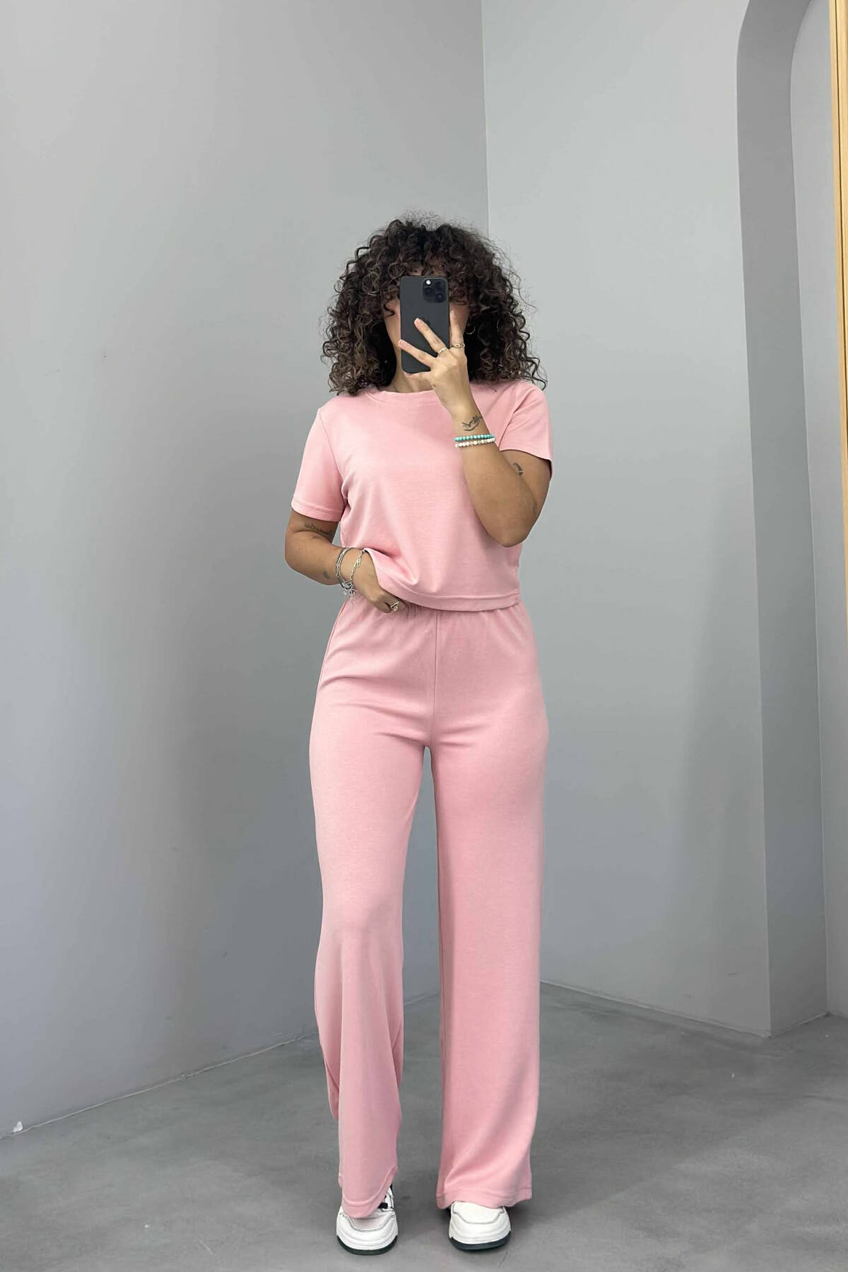 KOSTUM NJËNGJYRËSH ELASTIK T-SHIRT+TUTA PËR FEMRA NË NGJYRËN PUDËR