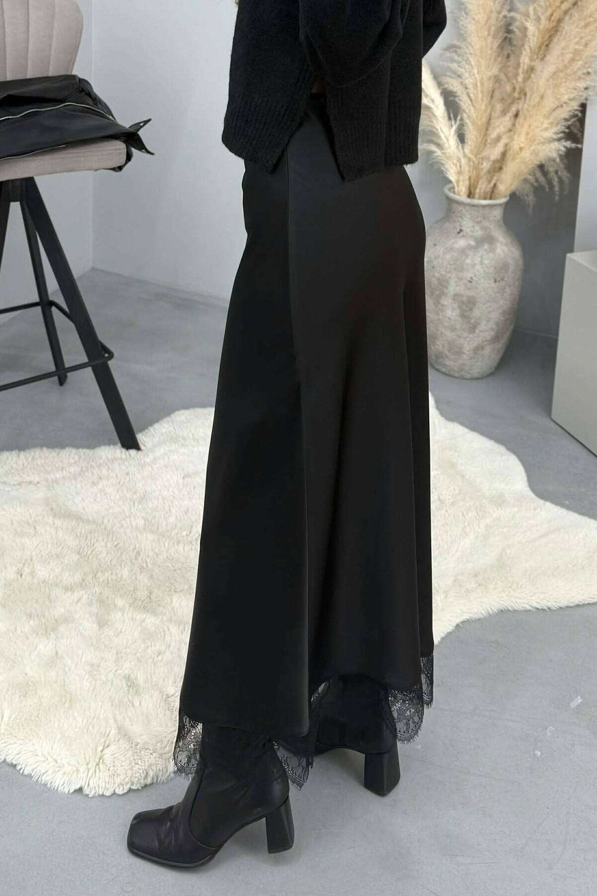 LACE DETAIL LONG SATIN WOMEN SKIRT BLACK/ E ZEZE
