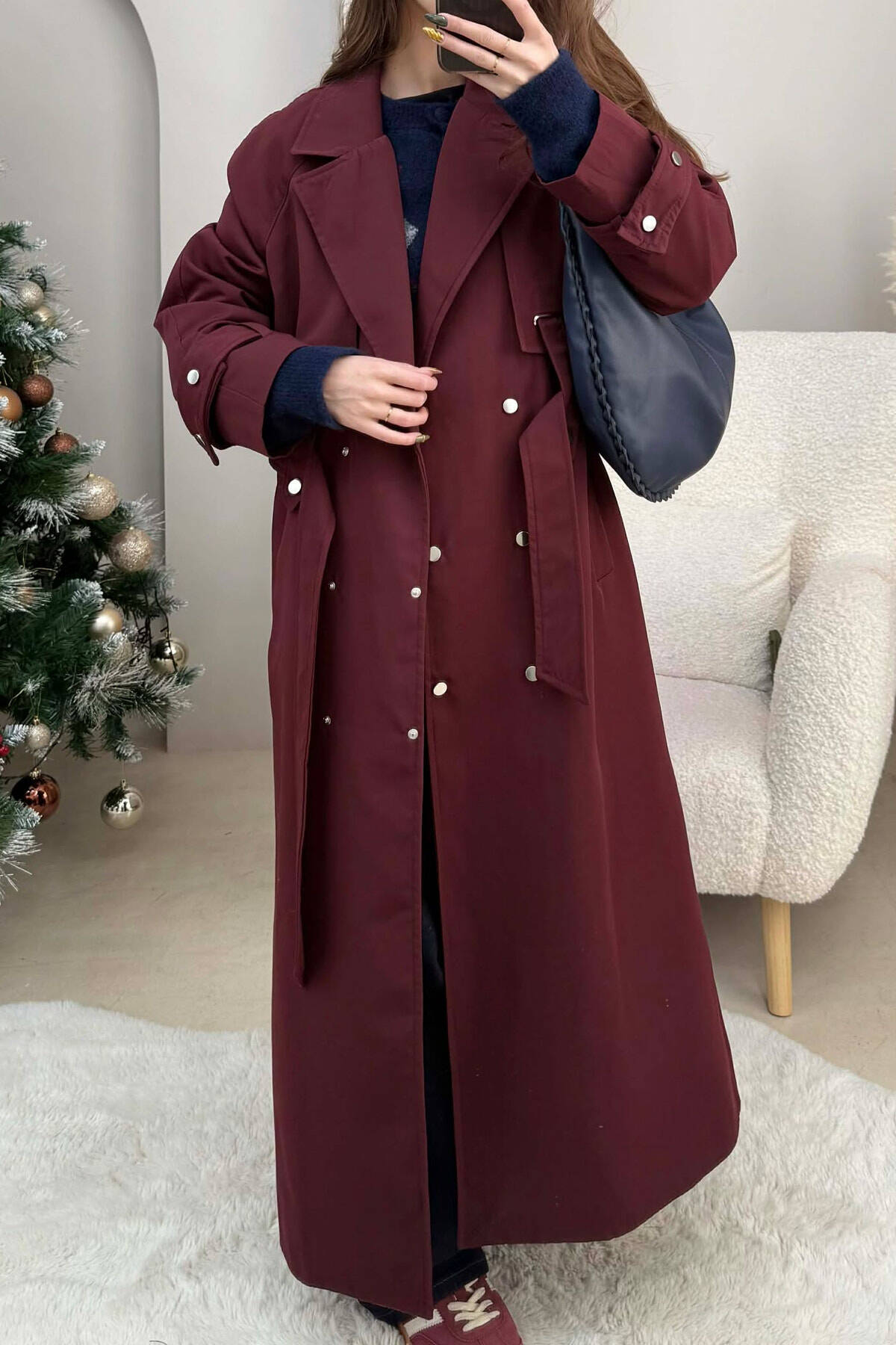 LACING DETAIL BUTTONED LONG WOMEN JACKET DARK BURGUNDY/VISHNJE E ERRET