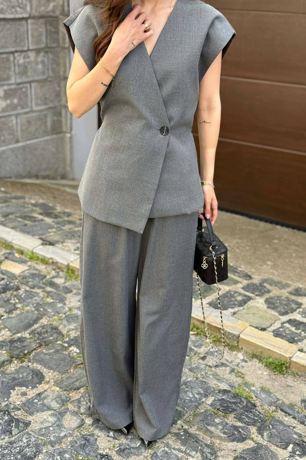 LACING DETAIL VEST +TROUSERS WOMAN SET DARK GREY/GEE