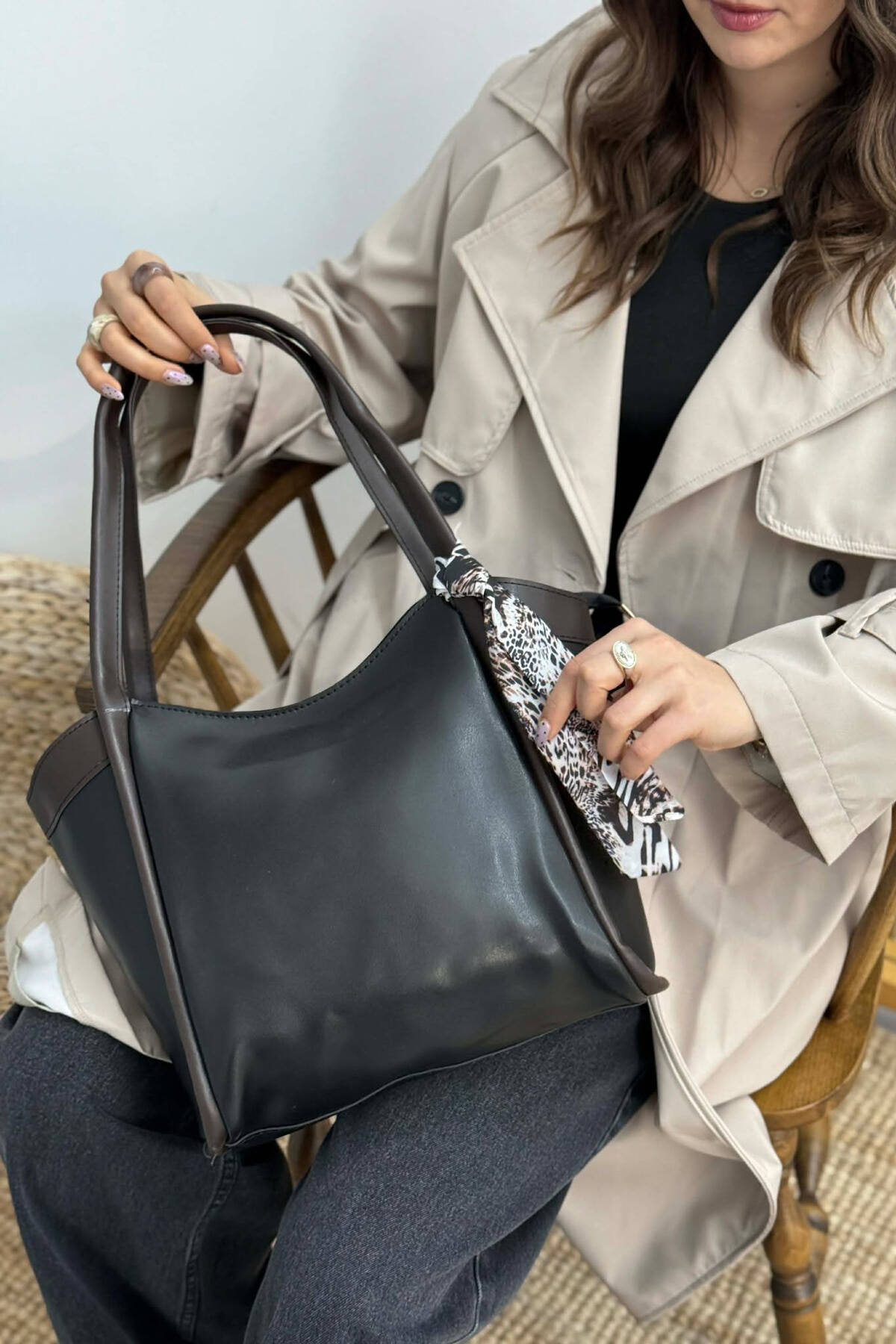 LEATHER SCARF DETAIL WOMEN BAG BLACK-BROWN/ZEKA