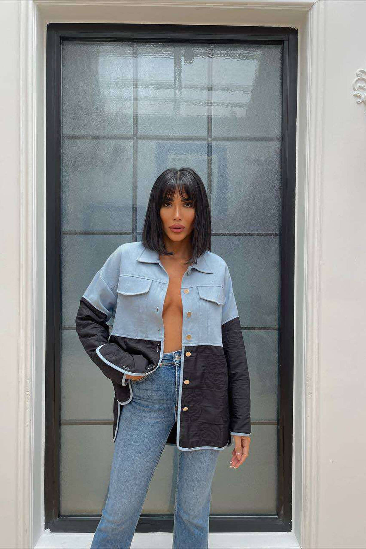 Xhaketë Në Dy Ngjyra Për Femra Në Ngjyrën Blu Të Zbardhur Dhe Të Zezë