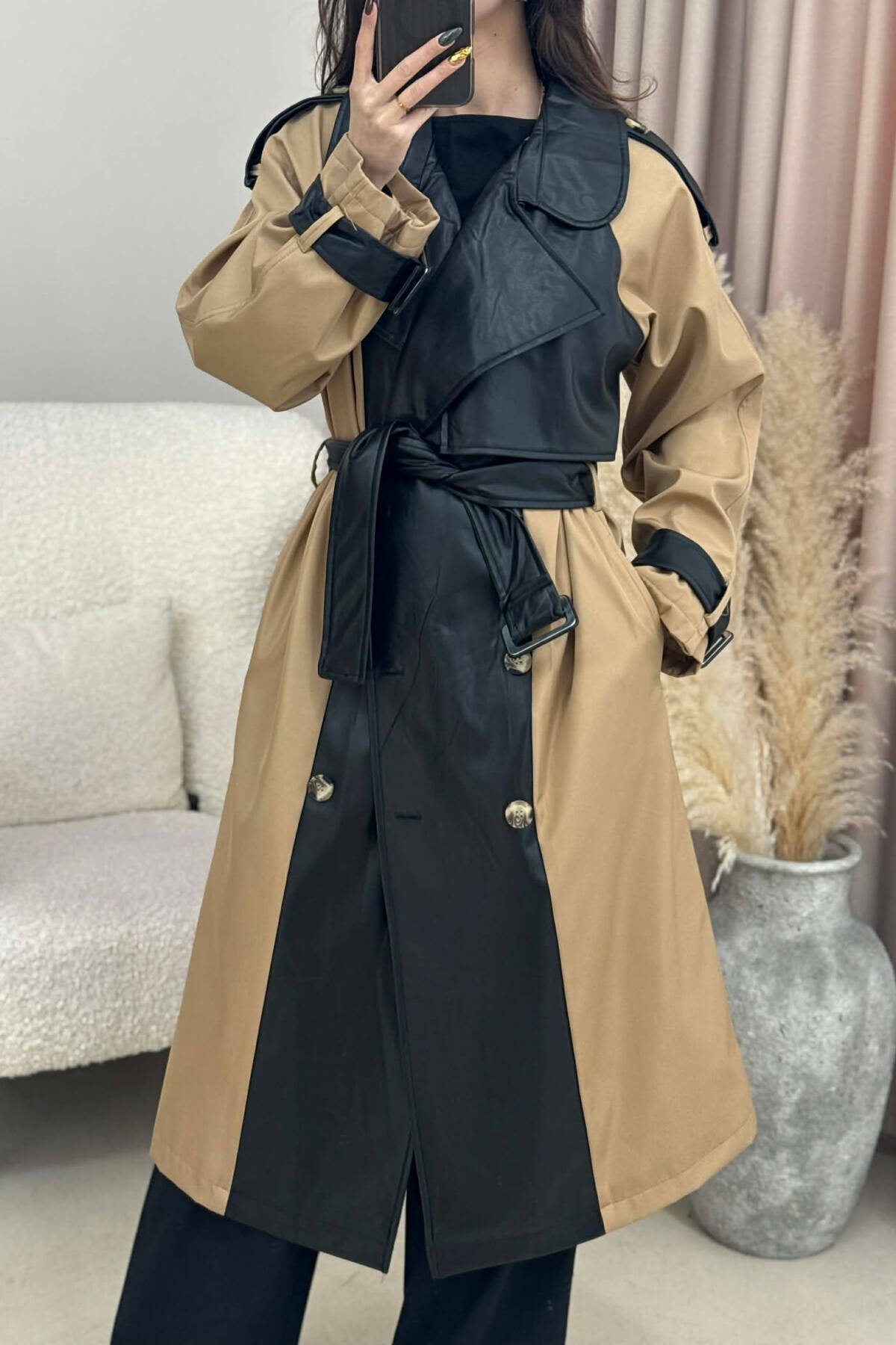 LONG SIMPLE BUTTONED WOMEN TRENCH COAT BLACK-BEIGE/ZEBE
