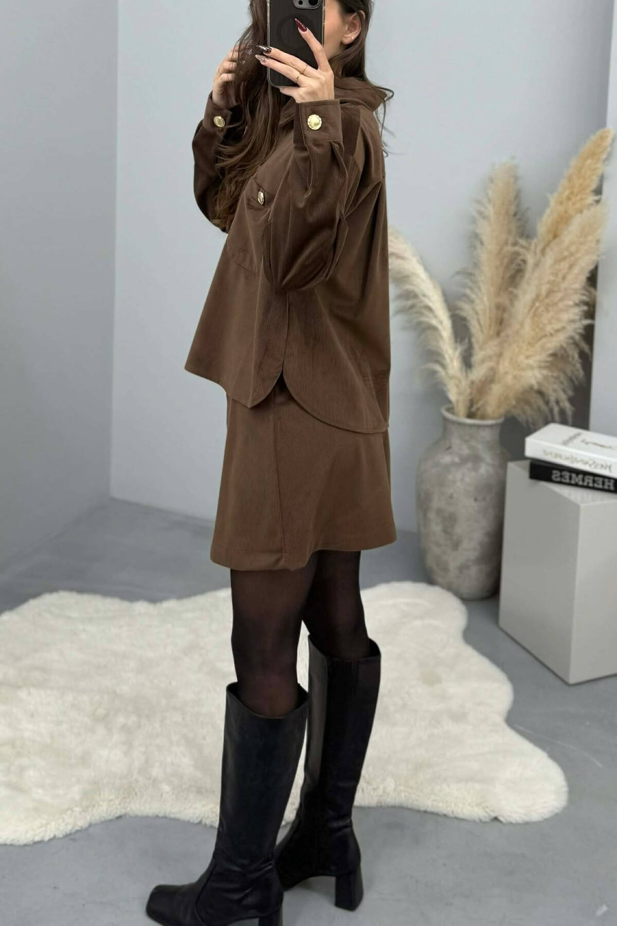 LONG SLEEVES SHIRT+SKIRT GOLD BUTTONS WOMEN SET BROWN/KAFE