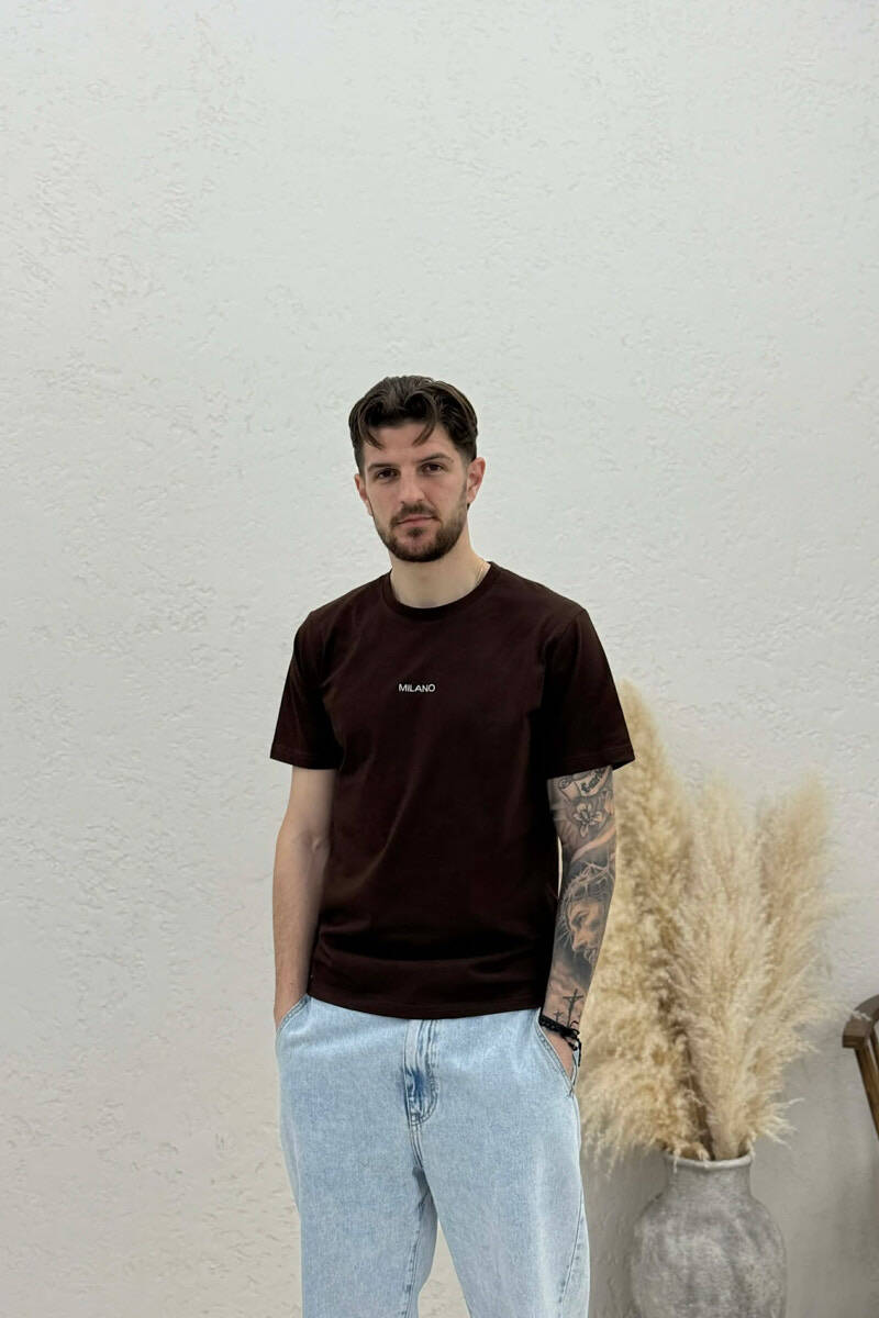 T-SHIRT I THJESHTË ME SHKRIME PËR MESHKUJ NË NGJYRËN KAFE TE ERRET