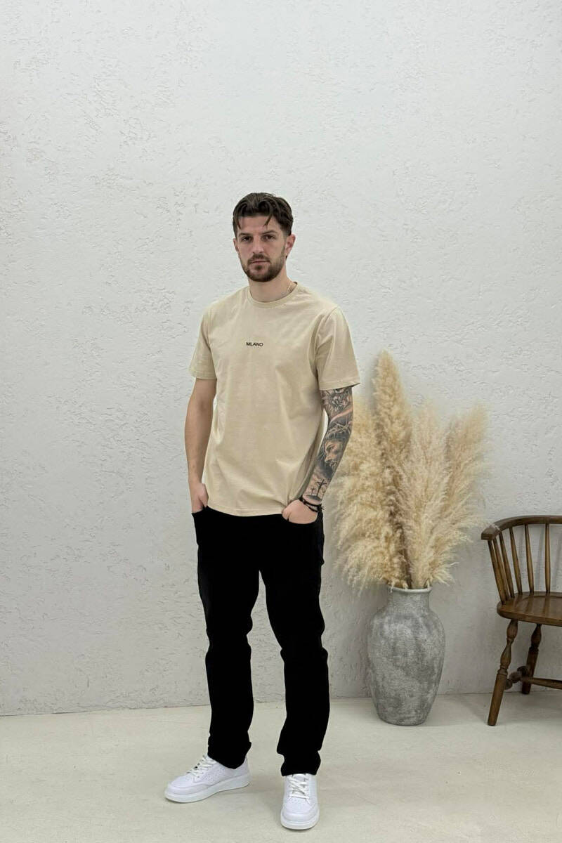 T-SHIRT I THJESHTË ME SHKRIME PËR MESHKUJ NË NGJYRËN BEZHE TE ZBARDHUR