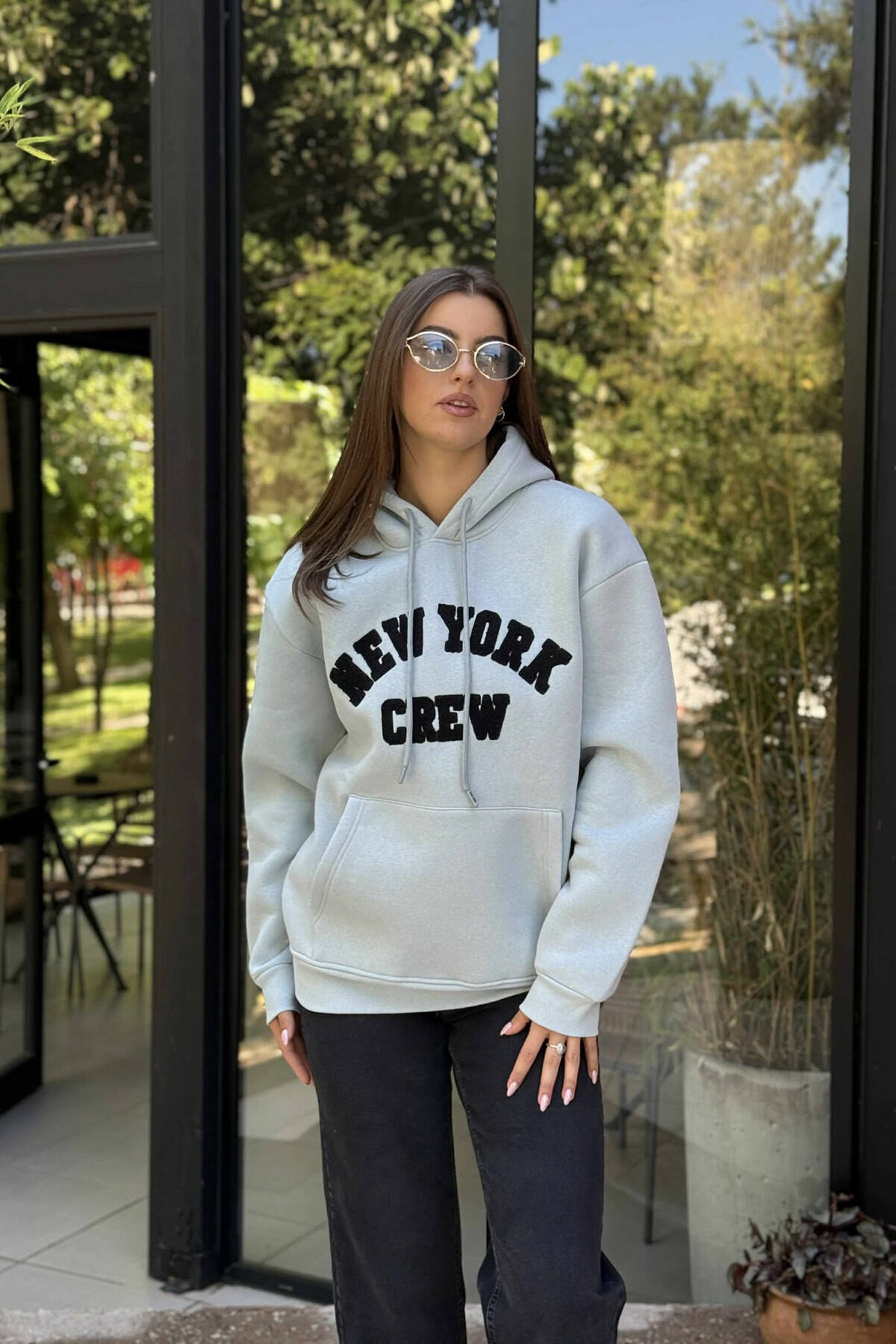 NEW YORK FLUFFY ONE COLOR WOMEN HOODIE LIGHTBLUE/BZ